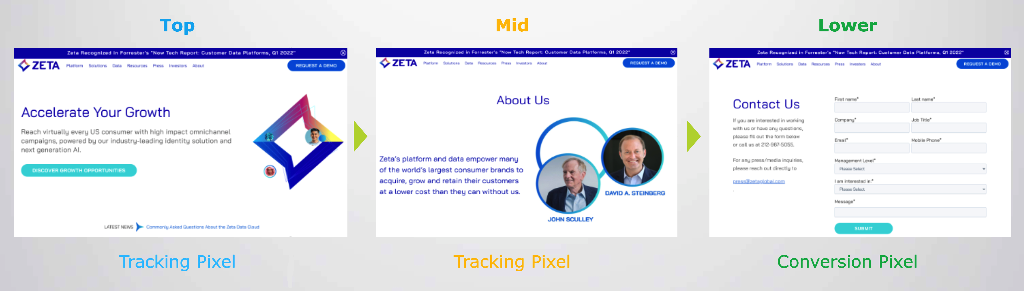 Pixels unobtrusively allow websites to record the relevant web activity of their customers. This information in turn facilitates campaign performance measurement, conversion event tracking, and audience insights across Zeta solutions.