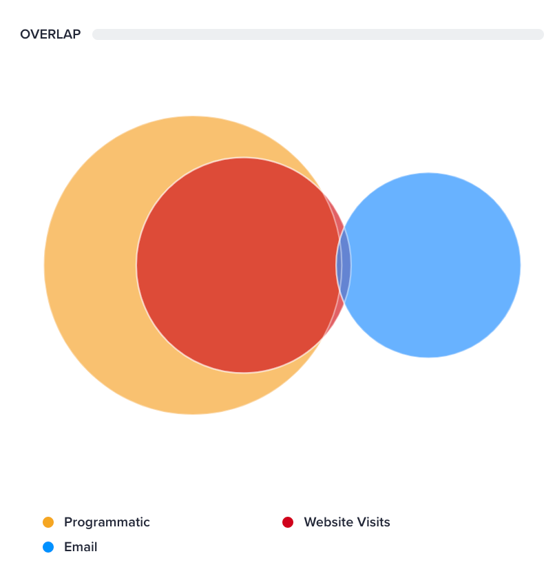 In the Overlap section, a Venn Diagram displays the percent of converters reached by each channel individually and together. Hover over any of the ovals to see a percentage breakdown of users reached by that/those touchpoint(s).