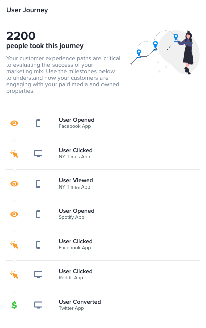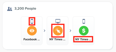 Clicked | ![]() | The cursor icon indicates when a user clicks on an ad, email, or SMS message. The color of the icon or circle corresponds with the channel that the click took place on. |
