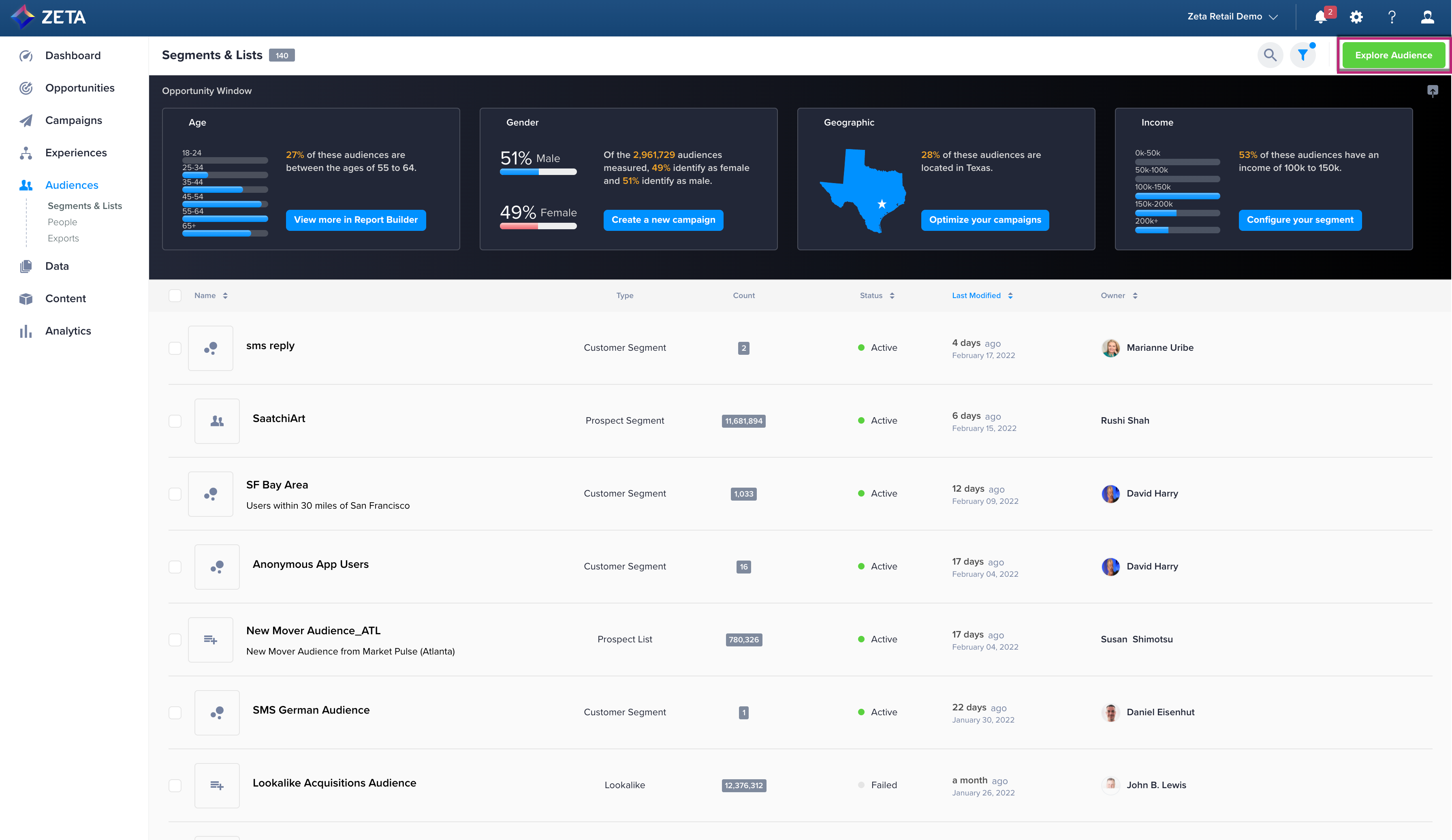 From the menu on the left, Navigate to Audiences > Segments & Lists. Click on Explore Audience to head on to the Audience Explorer.