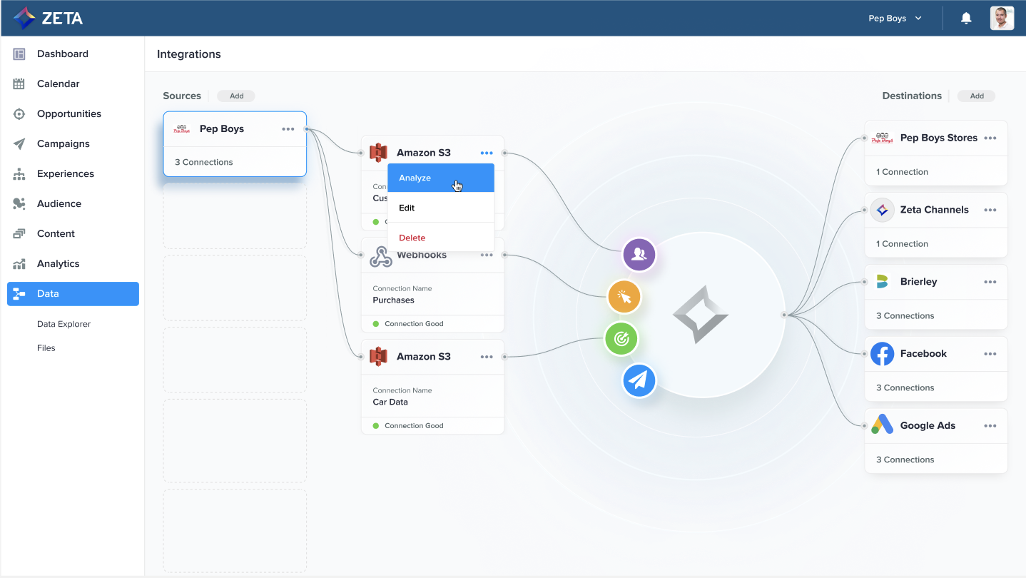 An Automotive retailer uses the Zeta Marketing Platform to capture all their e-commerce, automotive scheduling, and work orders, and maintain car history and marketing preferences for a customer. The ZMP is the central repository of customer and car information that is accessible via API by their customer service team, POS system, and garage work order to maintain the most up-to-date details for their customers.