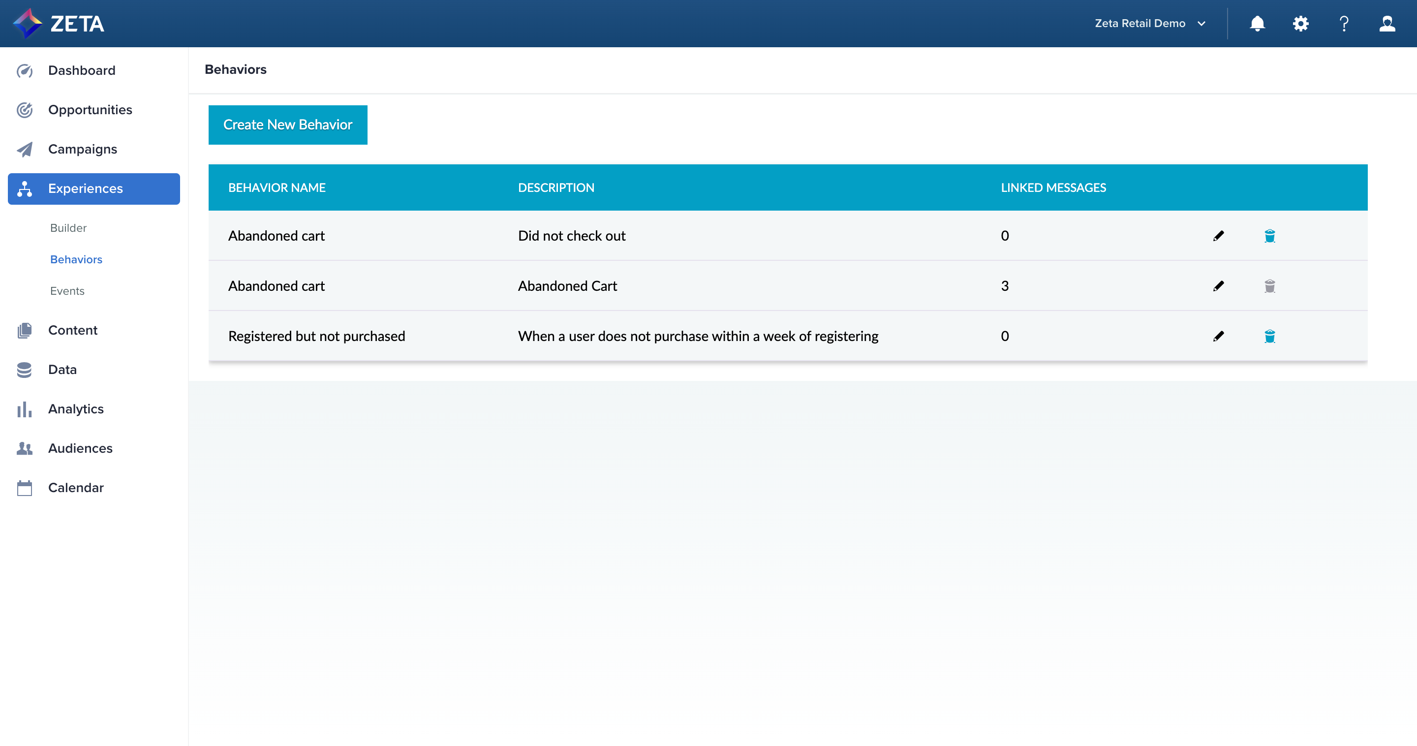 1. From the menu on the left, navigate to Experiences > Behaviors. Click on Create New Behavior.