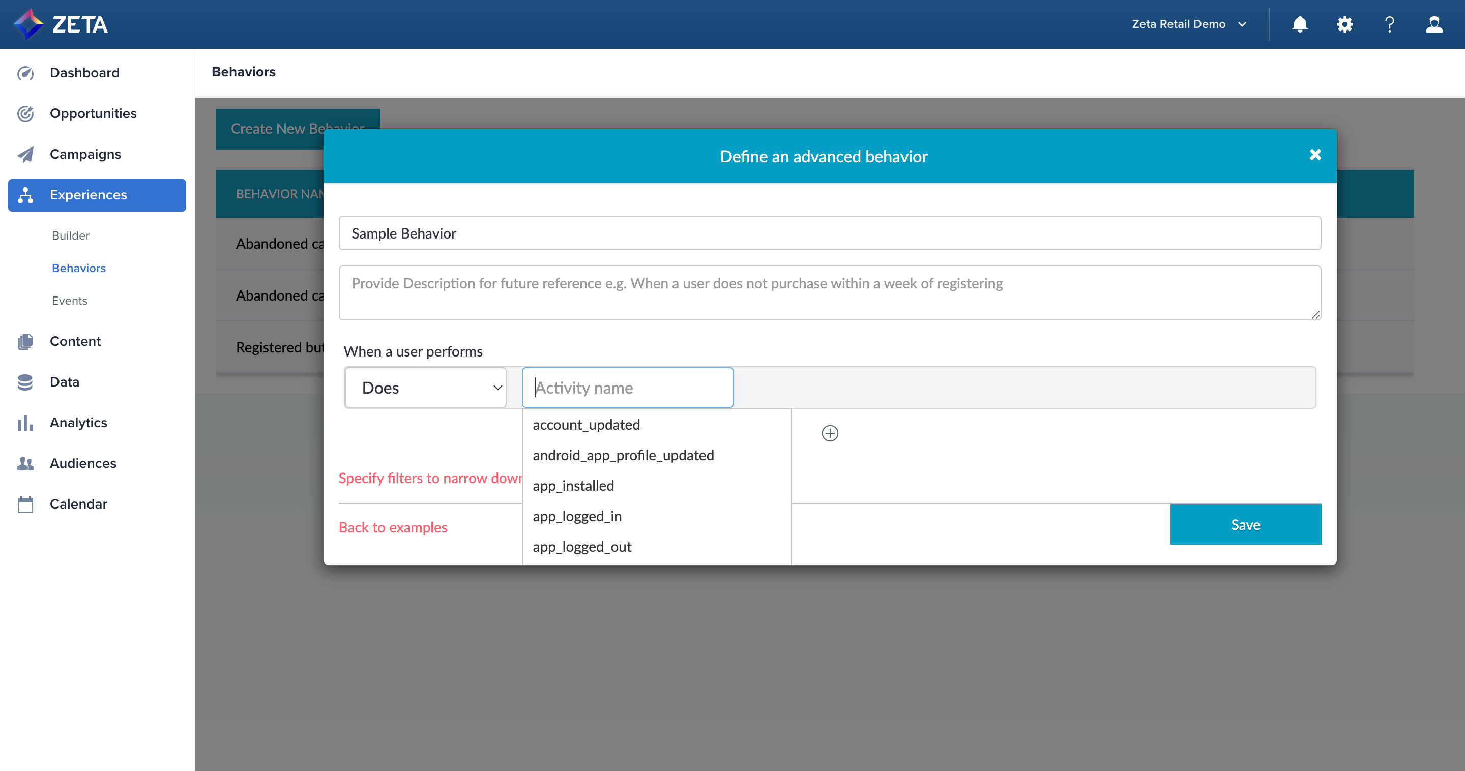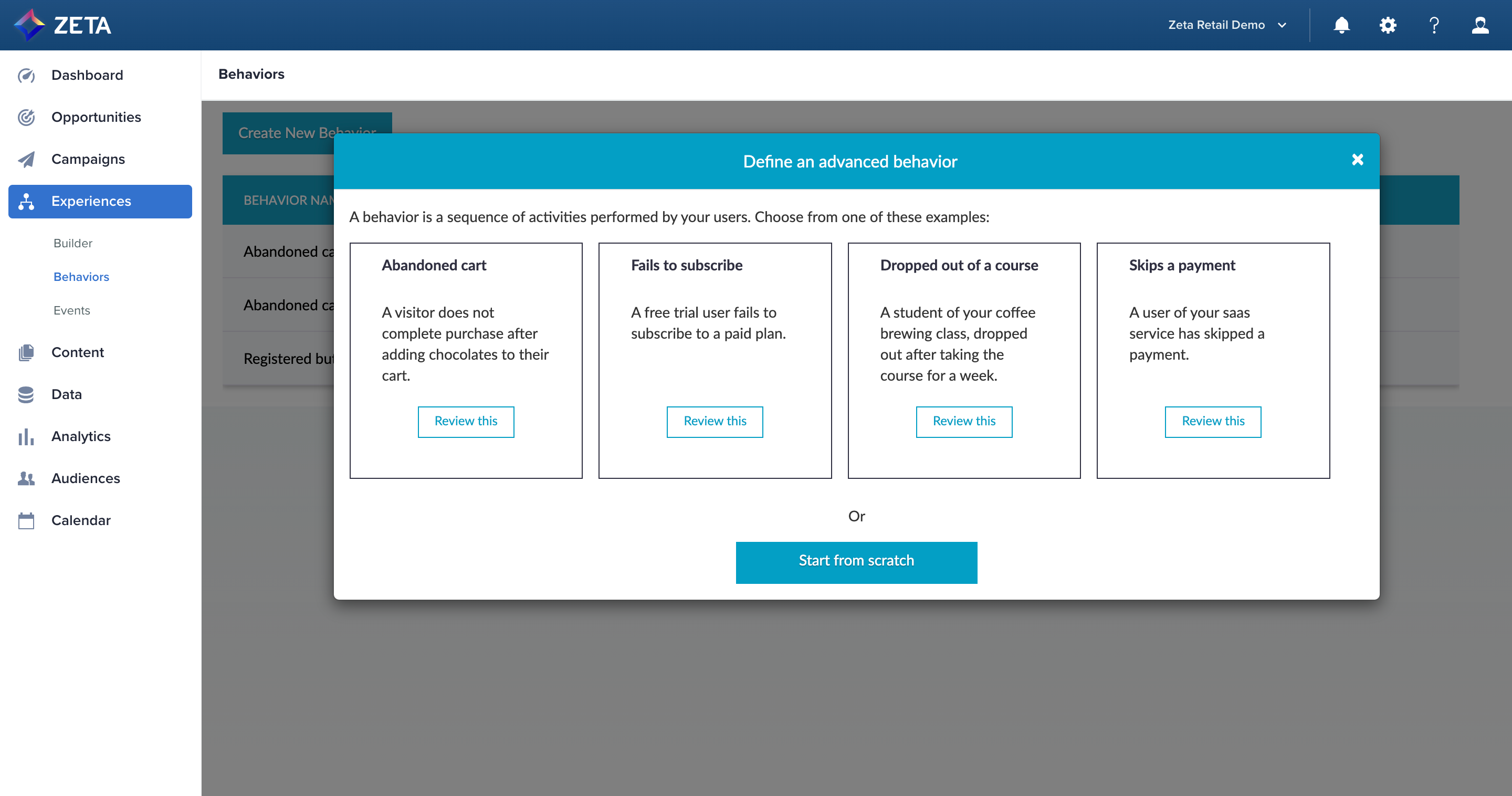 Zeta collects information from historical user data logs and actual user behaviors in real-time. The Zeta Marketing Platform then analyzes this data to identify different behavioral patterns. We also allow you to add in a new sequence of activities to the platform, that might usually be performed by your users so you can leverage these behaviors in experiences and other event-based functions.