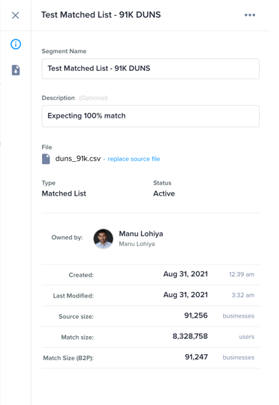 Once a Business Match List is created, these columns will appear on the panel of the list. To see this panel, click on the white space of the completed list on the Segment and List page on the ZMP.