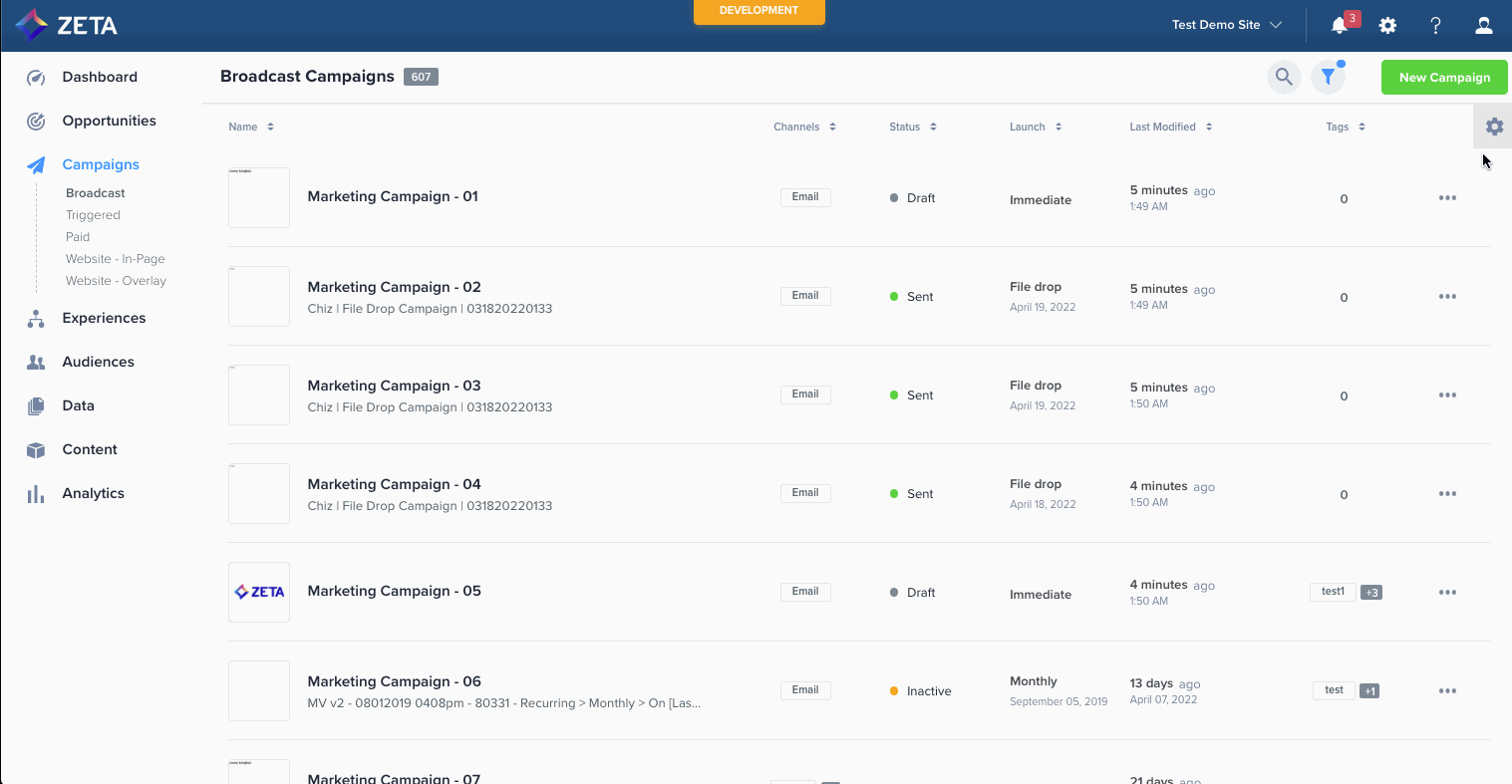 By default, there are six columns shown in a campaign listing: Campaign Name, Channels, Status, Launch(for Broadcast Campaigns) or Trigger (for Triggered Campaigns), Tags, and Last Modified. Refer below for the details shown on each default column: