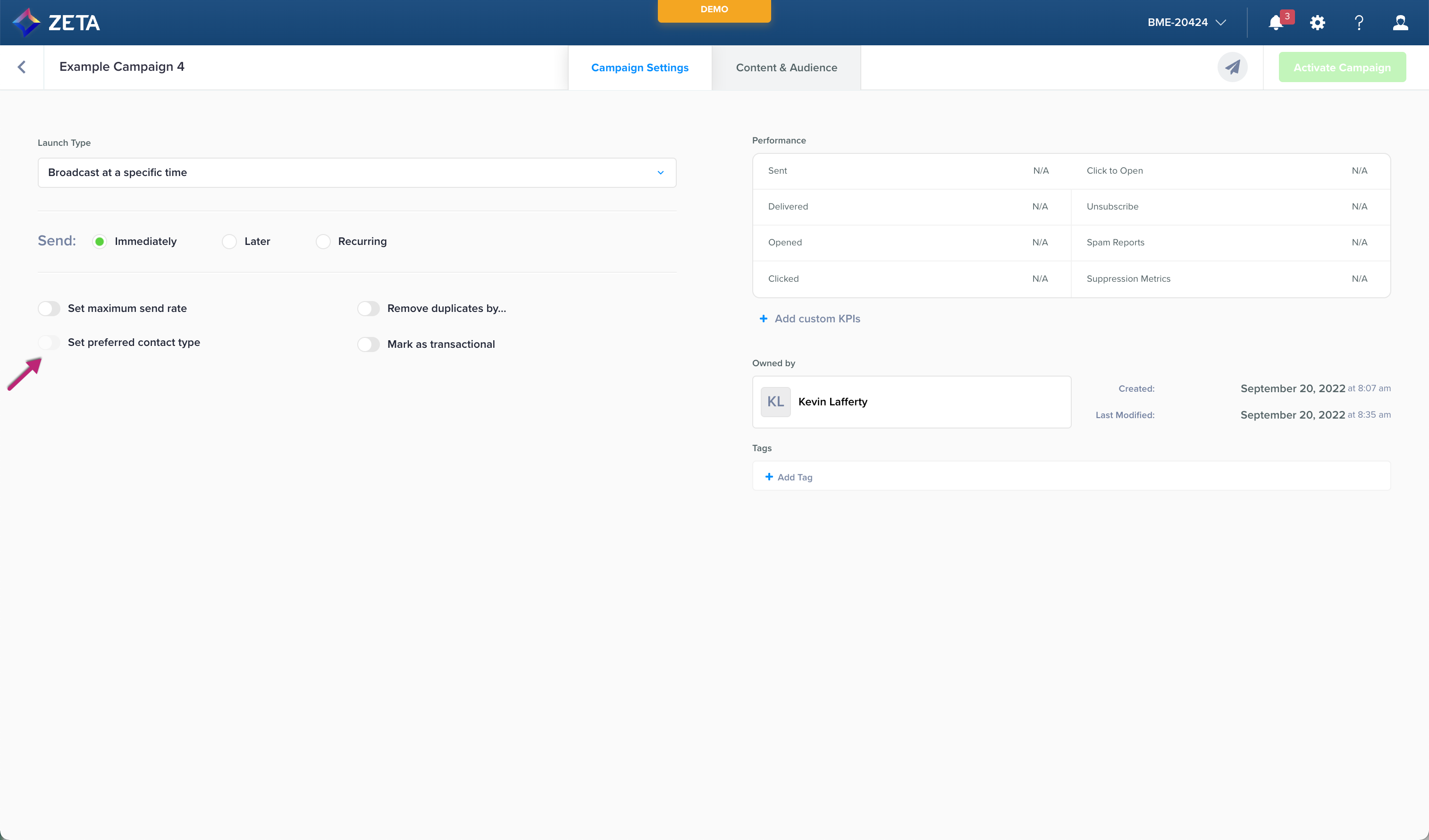 In order to choose a specific email address or contact value of the user that the campaign should be sent out to, within the Campaign Settings page, turn on the toggle for Set preferred contact type.