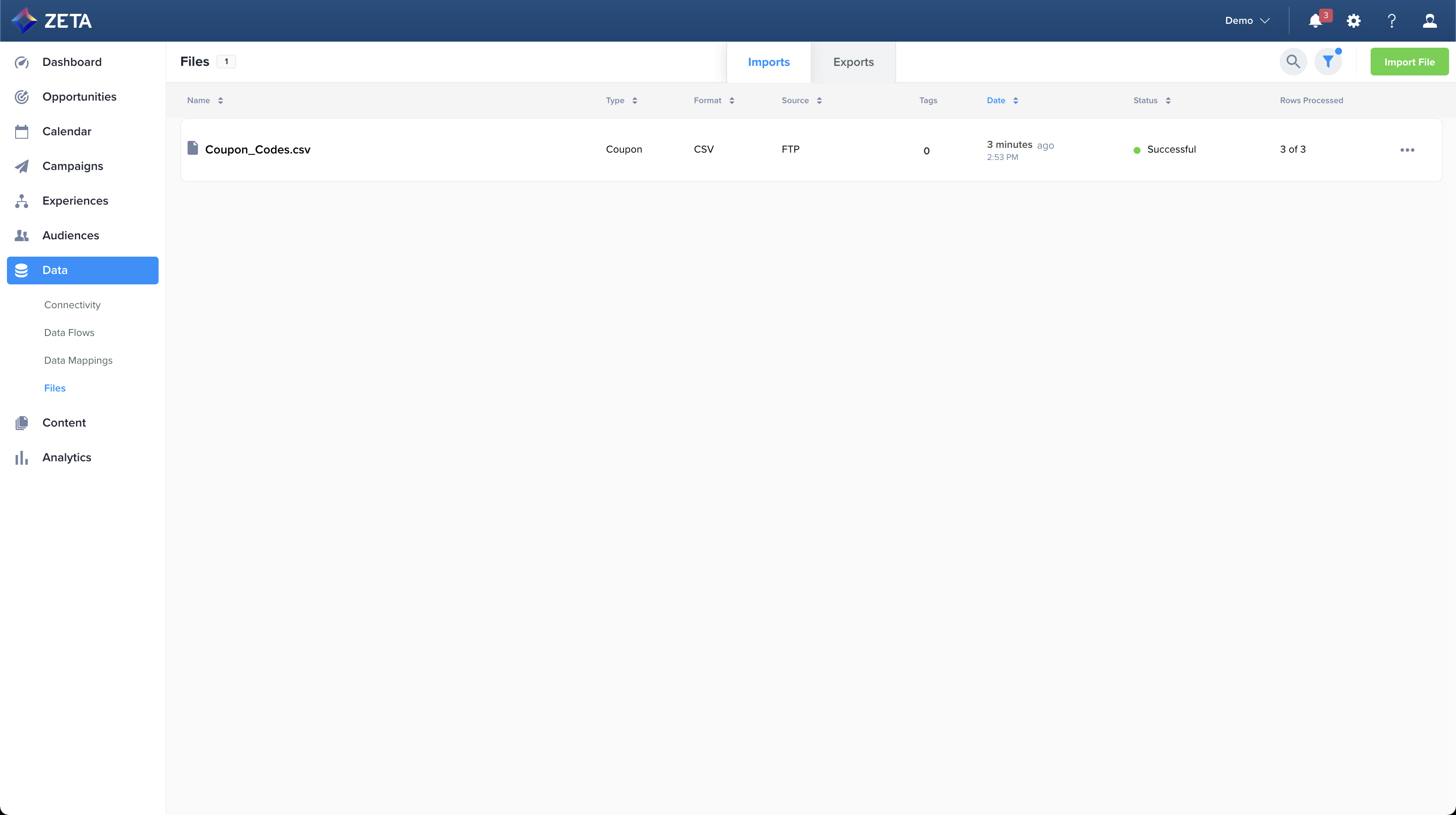 You can confirm your import status by checking for your file within the Data > Files tab in ZMP.