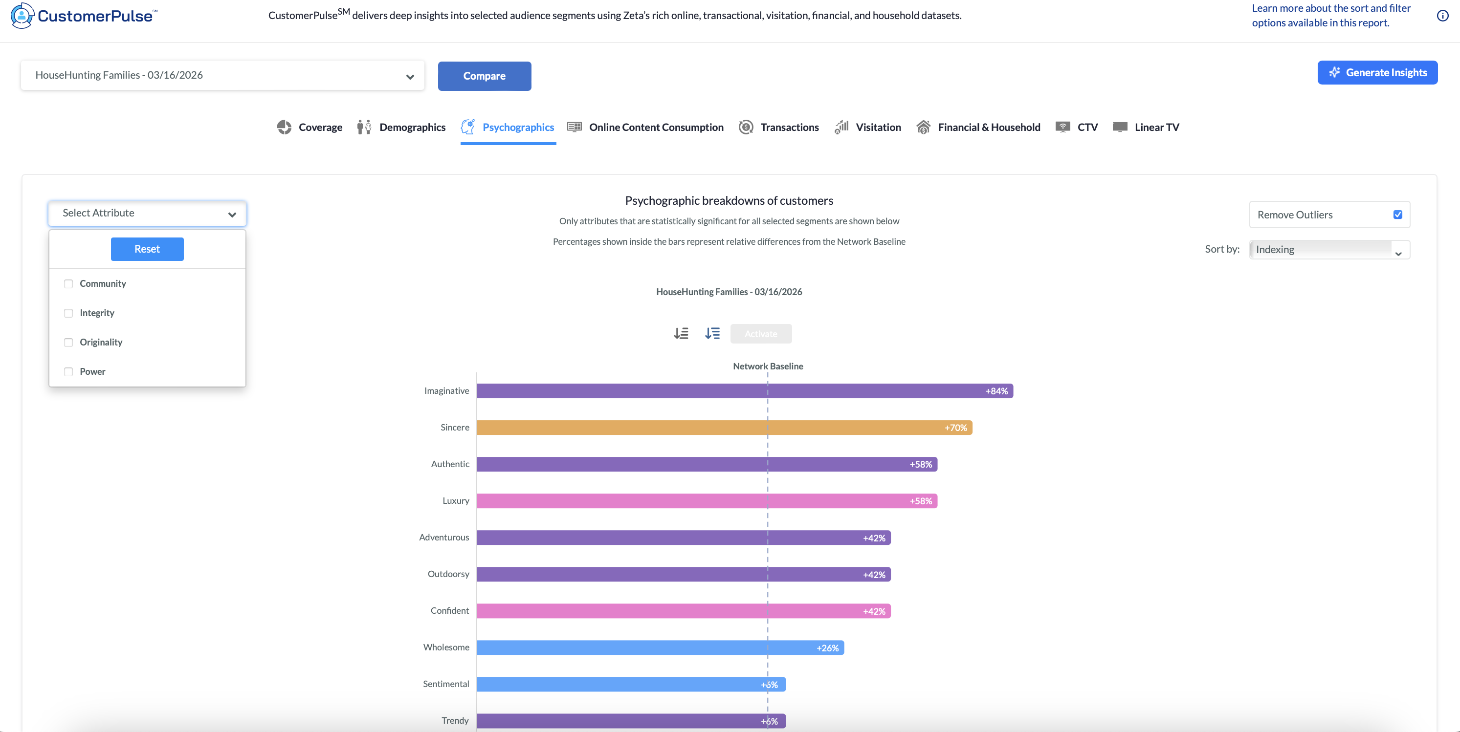 CustomerPulse enriches any segment (1st party or prospect segments) and profiles customers across 5,000+ Zeta attributes to retain and grow your existing base and reach new customers who are most likely to engage with you. The report provides insights on demographics, psychographics, online content consumption, transactions, visitation, financial & household, CTV, and Linear TV. Simply put, CustomerPulse allows clients to: