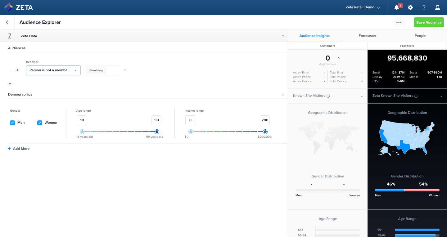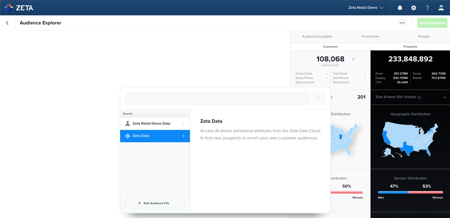 1. Within the Unified Audience Explorer, select Zeta Data to search for Prospect Segments to build acquisition audiences or enrich customer audiences.