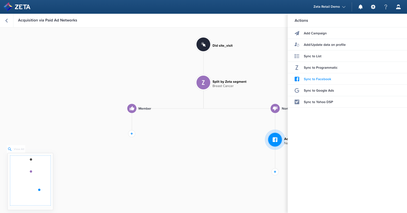 For accounts with Data Cloud features, you can leverage Zeta Data in Experience Builder to segment people who flow through your automated workflow. These people are then eligible to be exported to Zeta DSP or our third-party partners.