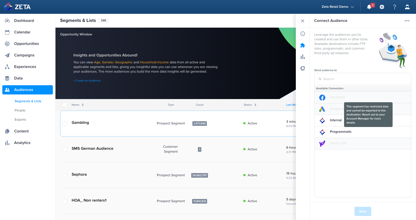 3. If you select a Zeta Segment that has restrictions, you won’t be able to use Experience Builder to sync to the relevant destinations on the Member side of the split.