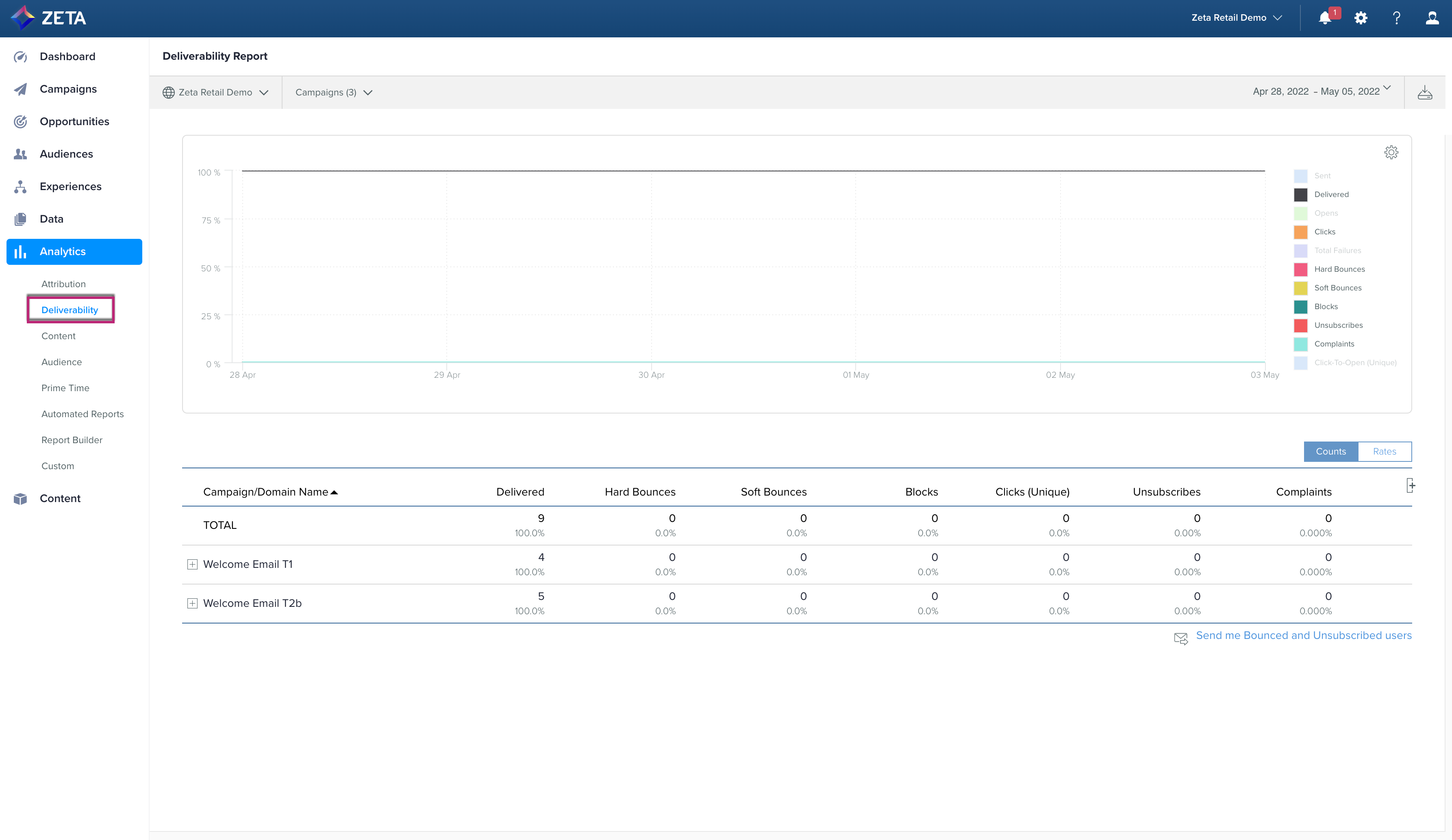 In the menu on the left, navigate to Analytics > Deliverability. View the associated report that appears.