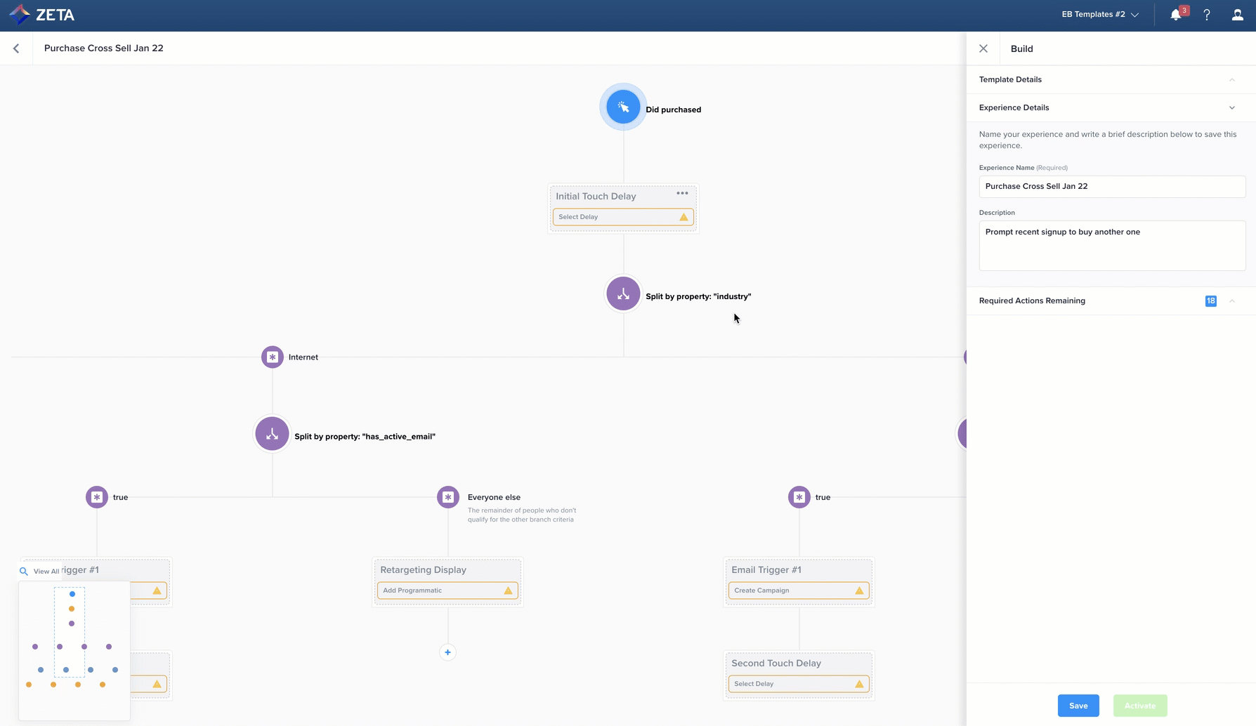 3. The Required Actions Remaining section of the Build panel keeps a running list of all nodes that require customization. These nodes are also marked specifically on the canvas with yellow warning icons and a CTA. Nodes that require customization are clearly marked, and the counter has 20 required actions: