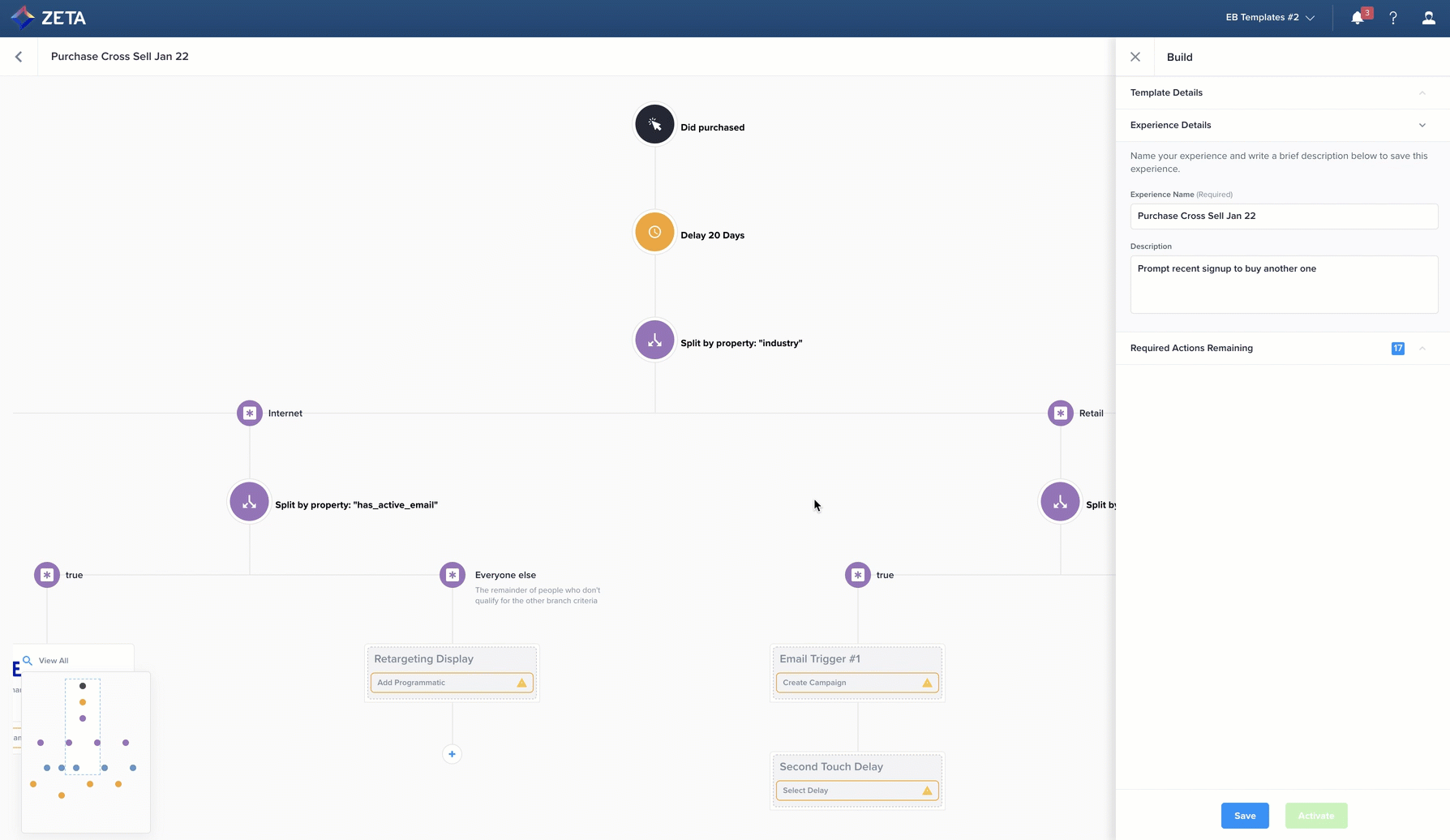 5. Once saved, the node reverts to a standard event icon and reopens the Build panel for the next item. The Required Actions Remaining counter has decreased to 17 to signify that you’re one step closer to finishing your experience.