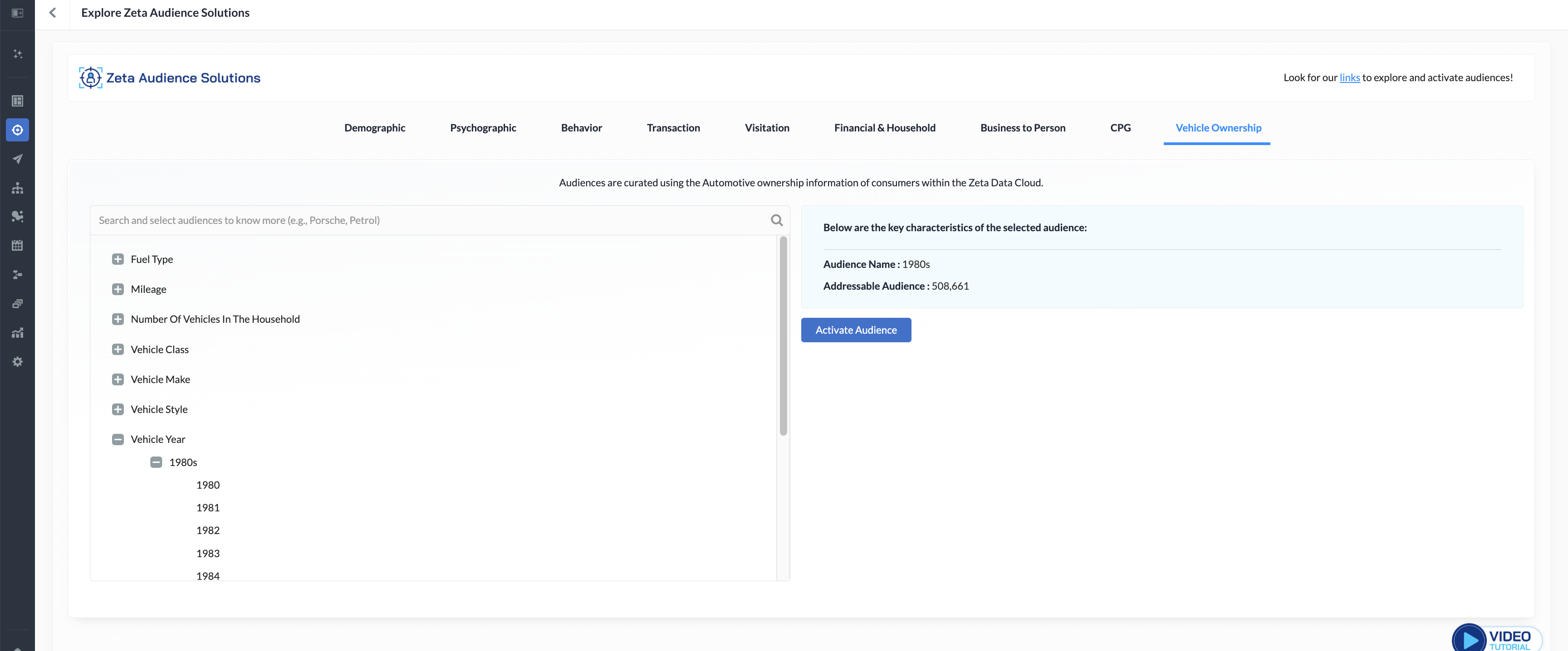 These audiences are curated from the automotive ownership information of consumers within the Zeta Data Cloud.