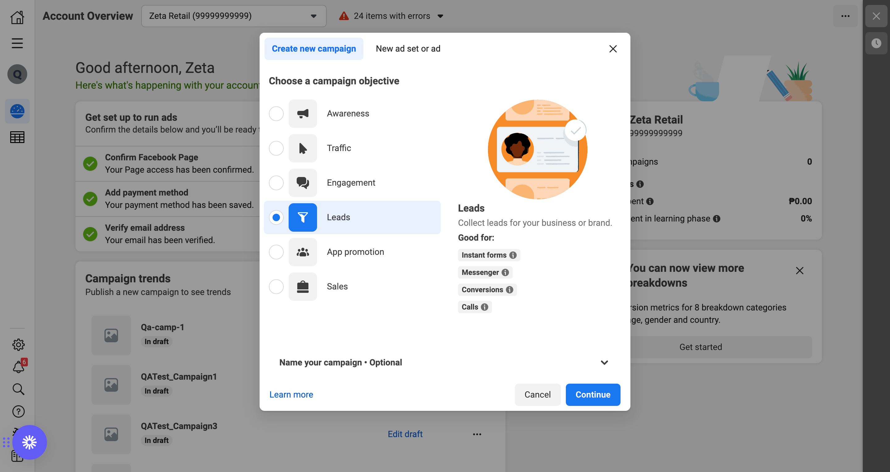 3. Navigate back to Ads Manager to create your ad and create a Leads campaign in Ads Manager.