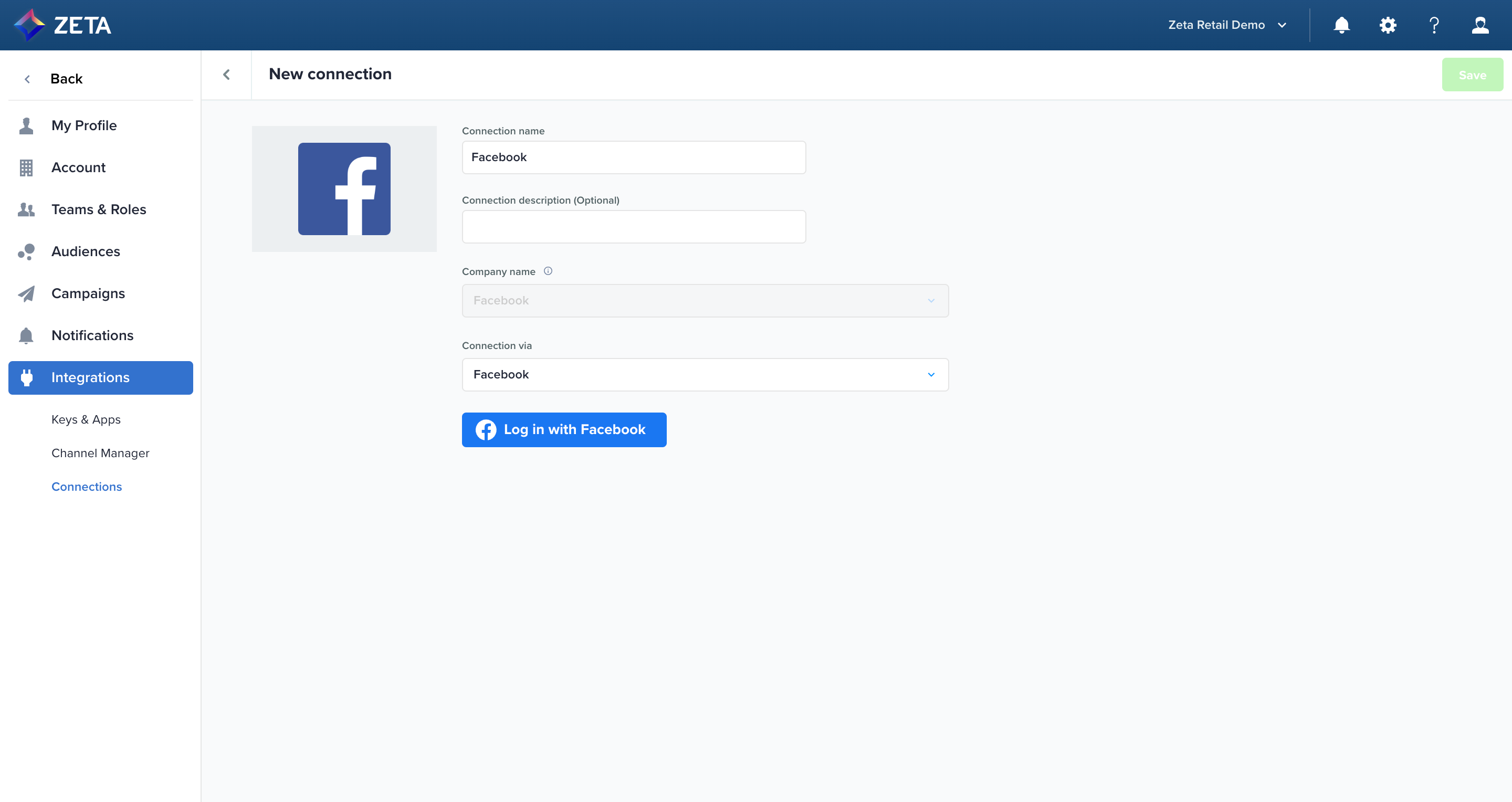 3. Select Facebook from the Connection via dropdown list.