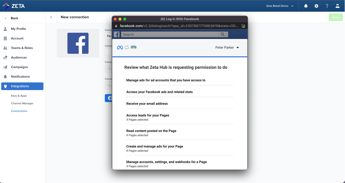 5. When prompted, make sure you accept all permissions so you can send data from ZMP to Facebook. If you have Pages, add the relevant ones so you can use the Meta Leads feature.