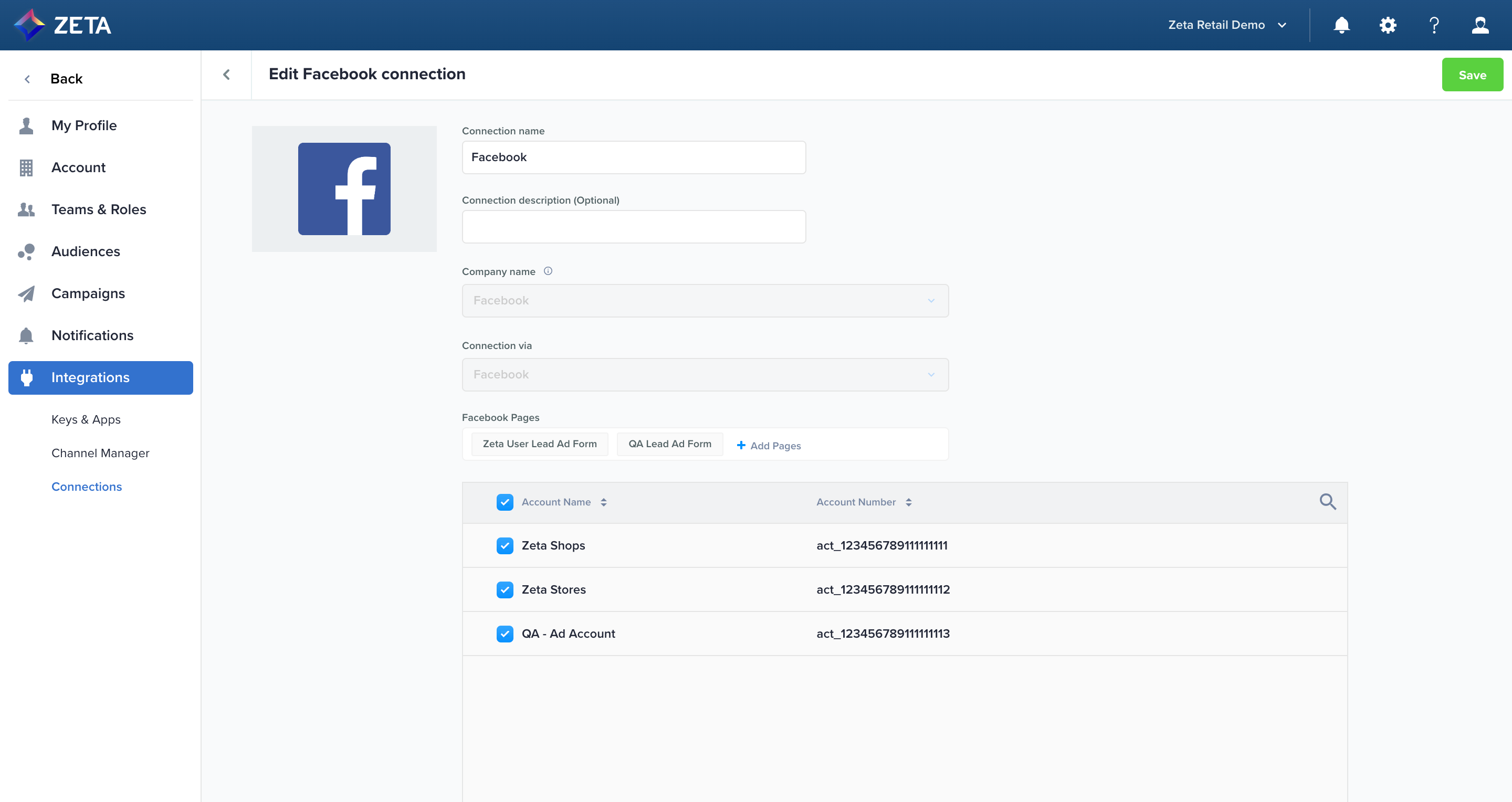 In addition to sending audiences from ZMP to Facebook, you can also instrument lead ads on Facebook and Instagram that can take user data and send it back to ZMP. This feature is available as soon as you authenticate your Facebook account (as demonstrated earlier in this article) and add Facebook pages to your ZMP account.