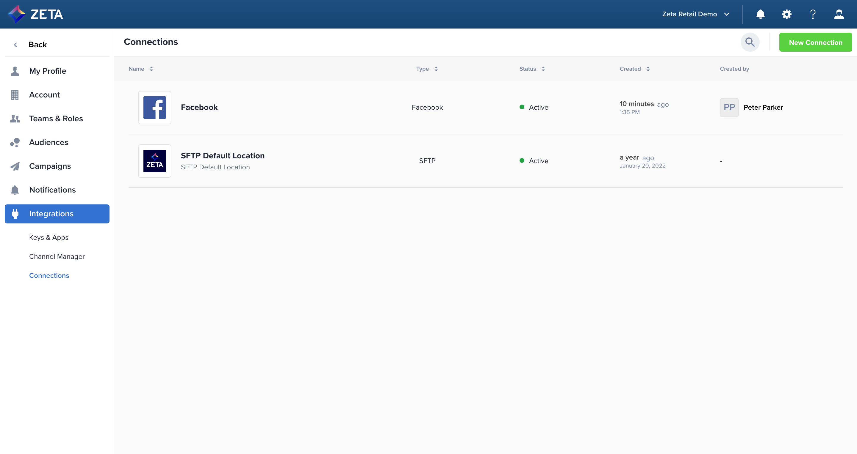 7. After clicking Save on the Facebook Connection page, you’ll be redirected to the Connections page where you can see the active status of your connection.