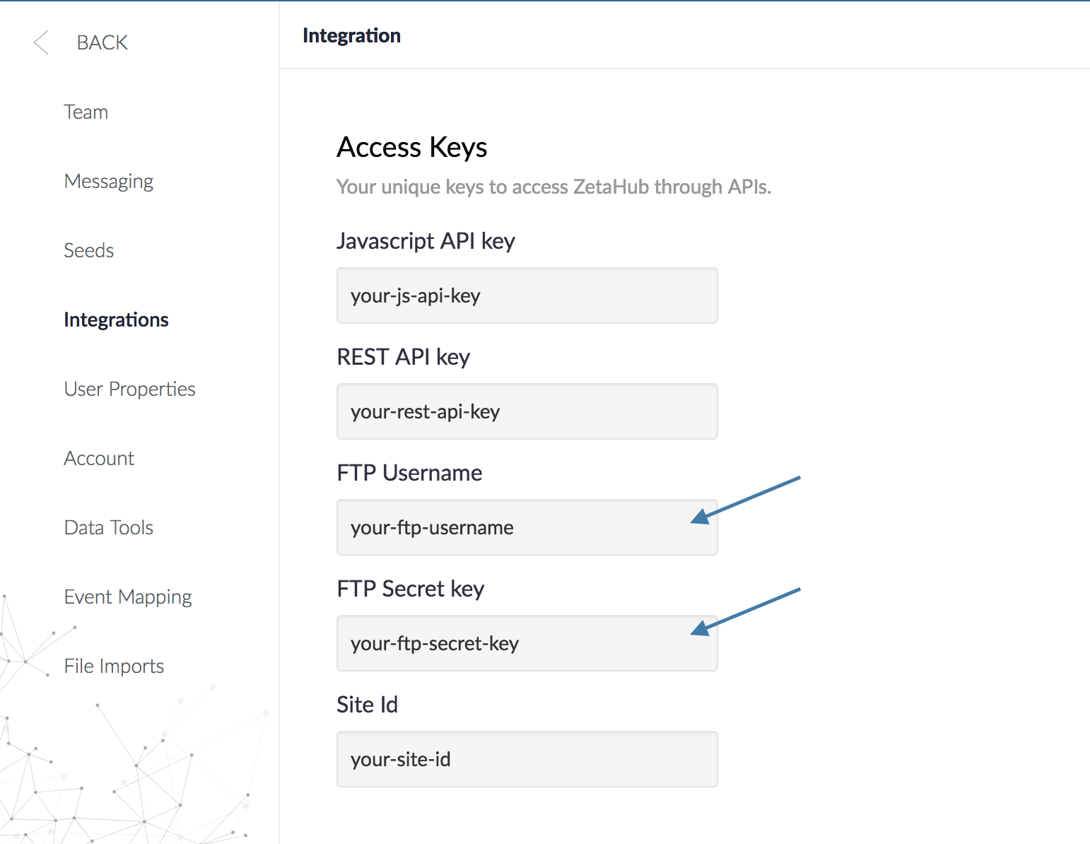 Once enabled, you’ll find an FTP username and password in the Settings > Integrations section of the platform. You will use these credentials to access the Zeta-Hosted FTP server for delivering your data file: