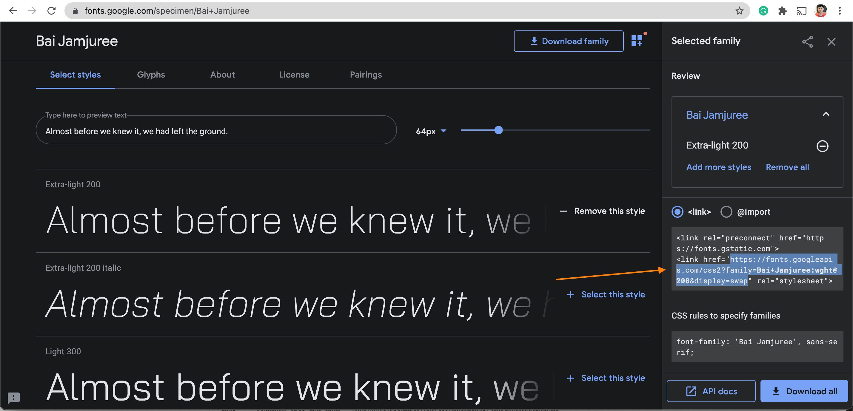 A font CSS file can be hosted by a tool such as Google Fonts or on your own servers. For example, Google Fonts provides the following link to a CSS file for the Bai Jamjuree font (in this example, only the Extra Light 200 style has been selected for the font):