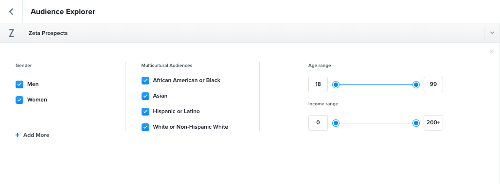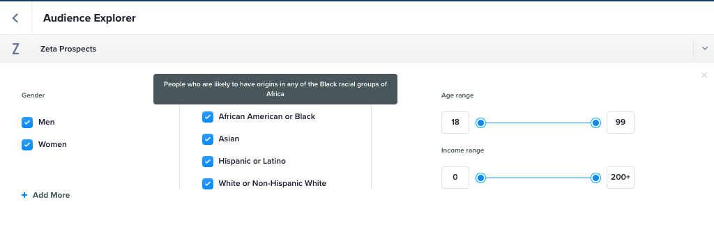 To support multicultural marketing, Zeta now supports Multicultural Audience Filters in Audience Explorer. By using Demographic Filters for Zeta Prospects, ZMP users can select people in the following segments: