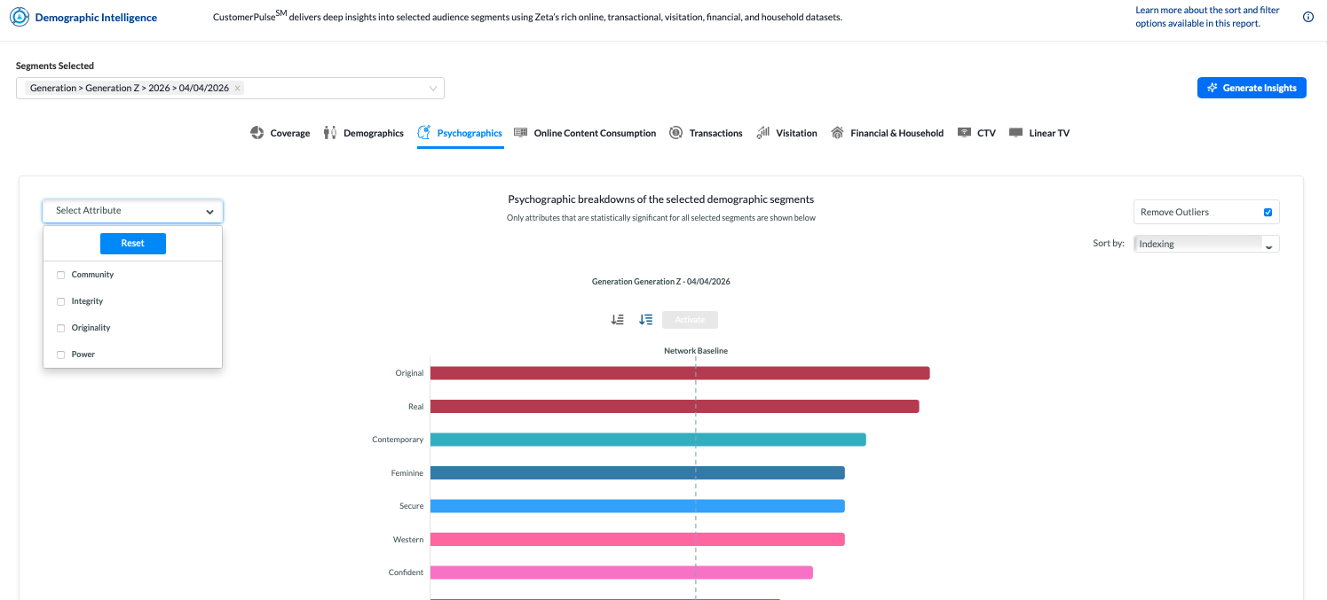The Psychographics section uncovers deeper behavioral and attitudinal traits of selected audience segments. It presents statistically significant characteristics such as personality descriptors, lifestyle labels, and values that are more or less likely within each group compared to Zeta’s network baseline.