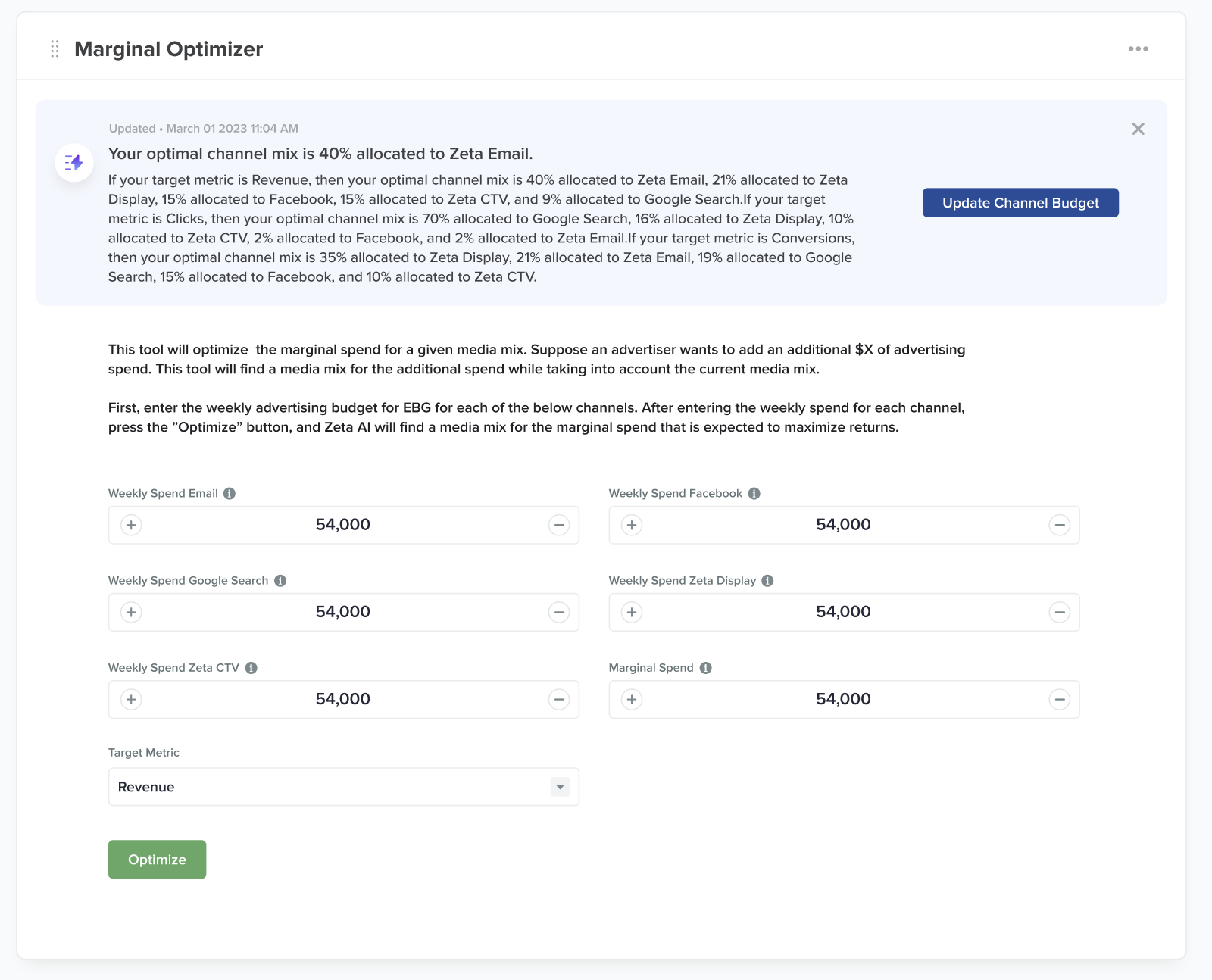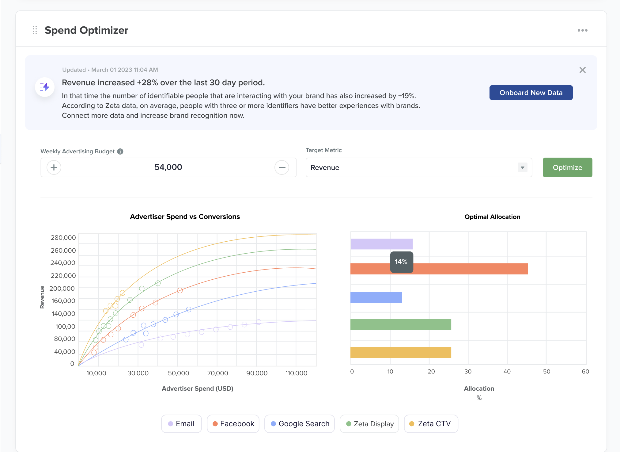 Say hello to our fully automated Optimized Spend tool, powered by our proprietary Zeta AI. This cutting-edge technology leverages the concept of diminishing returns to allocate your budget in the most effective way possible. By harnessing the power of advanced algorithms, it maximizes your return on investment across channels.