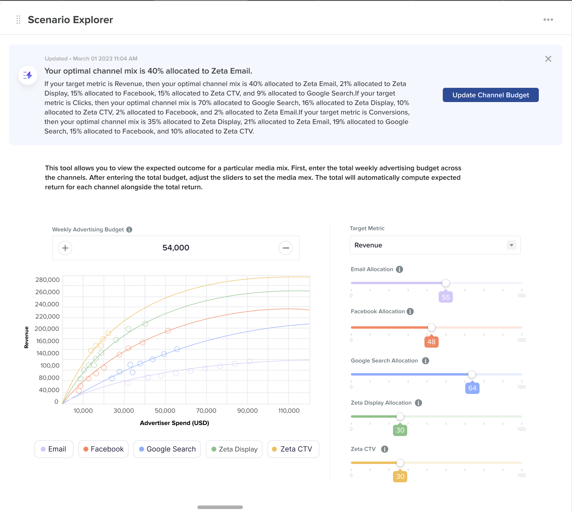 Today, many brands use a media mix or a combination of communication methods to reach their desired audiences. Media mix modeling can further help predict how media will perform based on previous activity and other factors like seasonality. To that end, Zeta has a comprehensive collection of Media Mix Tools to empower businesses to forecast and optimize their marketing efforts across multiple channels, including email, programmatic, CTV, Google Ads, Facebook Ads, and many more. Let’s quickly take a look at Zeta’s suite of media mix tools: