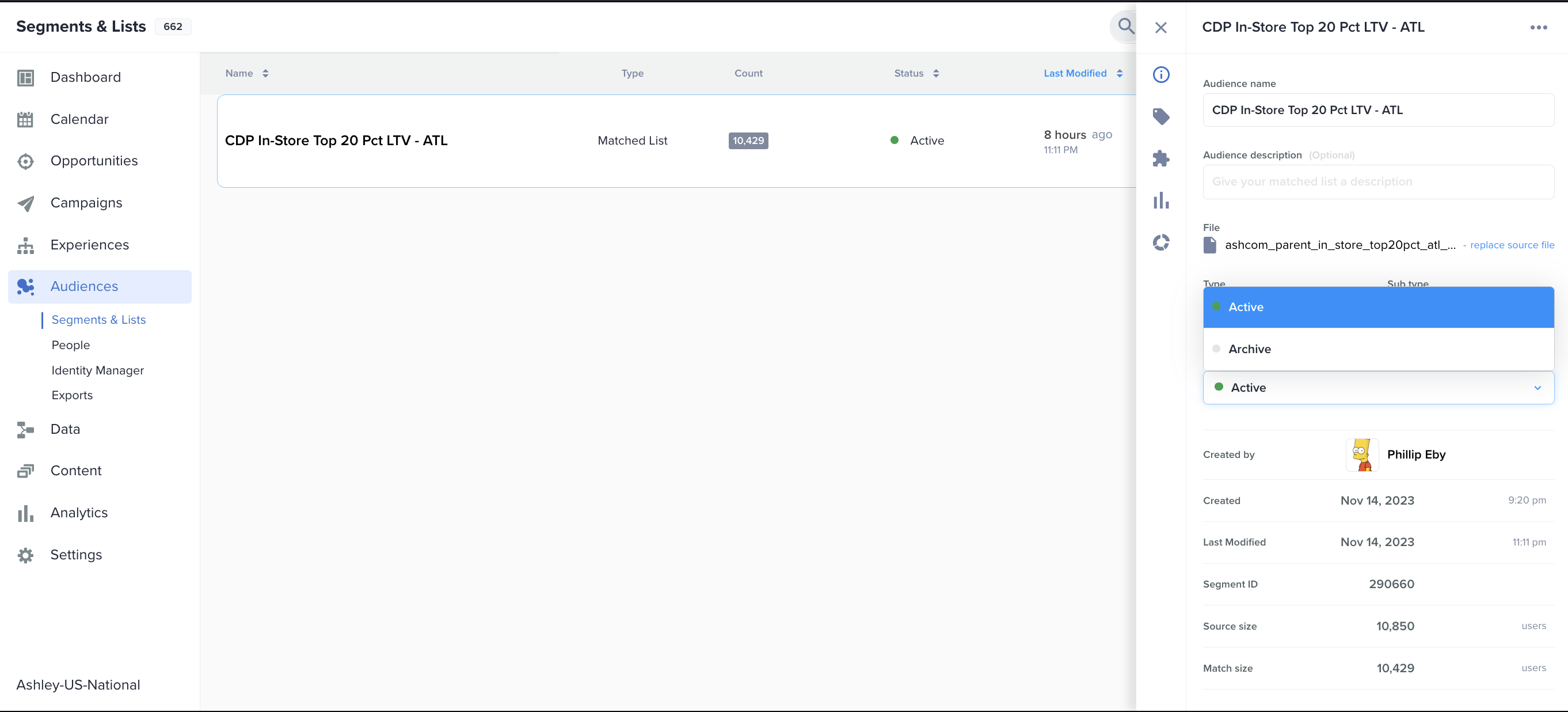 To archive a Matched List, navigate to Segments & Lists. Locate the desired matched list, click on it, and select Status > Archive. Confirm the archiving process through the prompted popup.