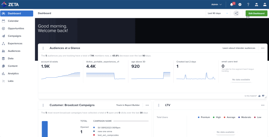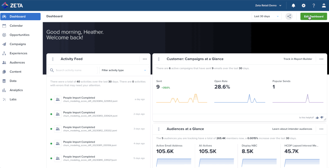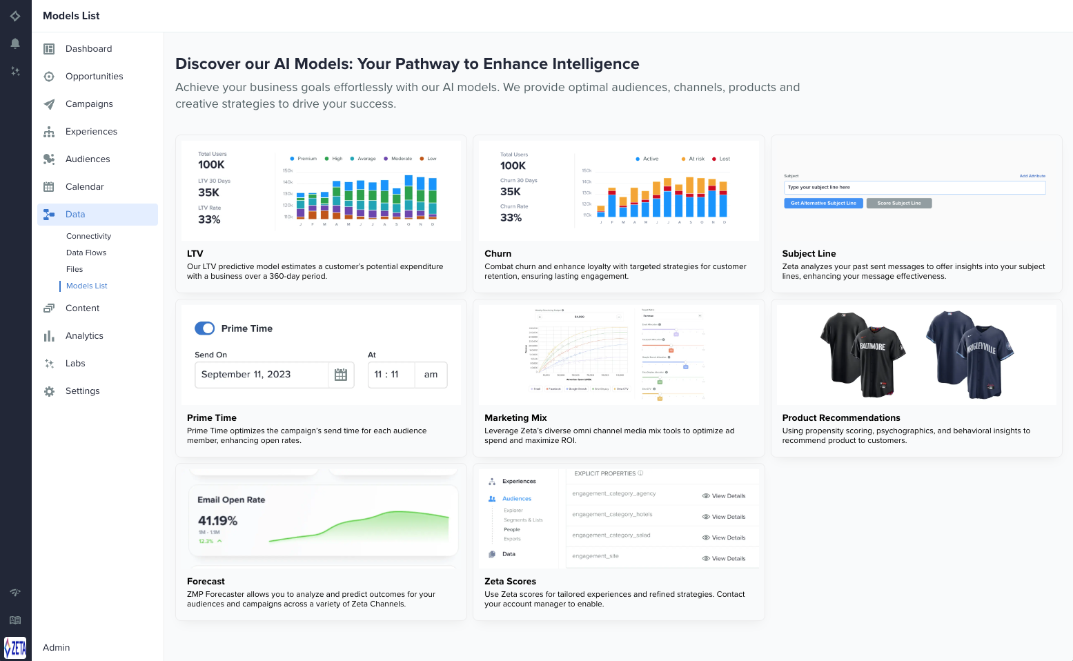 As marketing organizations mature, they seek more AI/ML-based insights to evolve their data strategy. To that end, Zeta has released new out-of-the-box churn and lifetime value (LTV) models to help you prevent churn and identify your most valuable customers. Available as widgets on the ZMP dashboard, these models refine audience segmentation and targeting. |