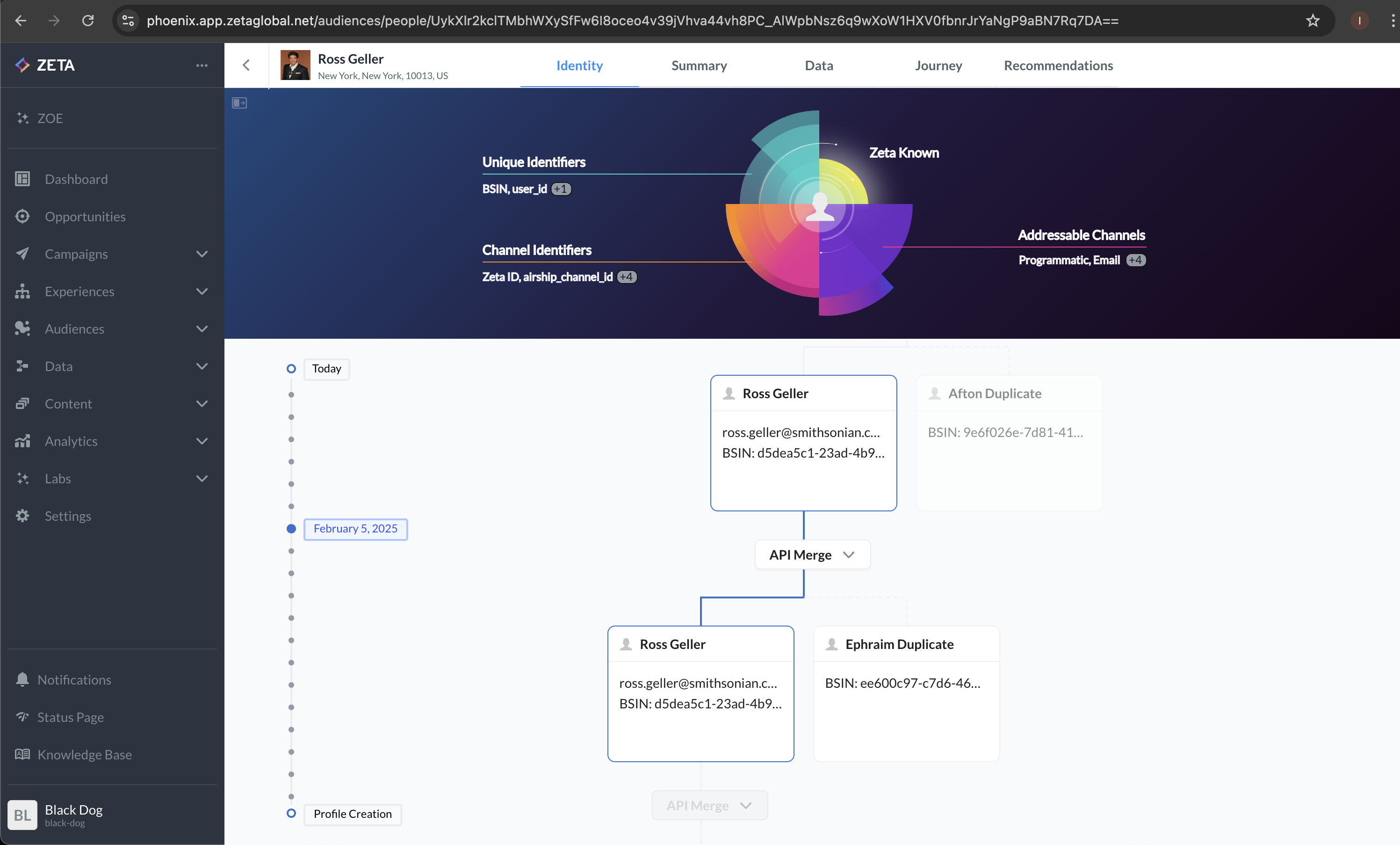 Identity Manager is an intuitive, marketer-friendly tool for configuring identity rules that consolidate disparate records from multiple sources into a single, accurate customer profile. It enables you to set and modify merging rules and exceptions, review rule changes and view key metrics at a glance—ultimately providing more transparency and control over identity resolution and customer record creation. Identity Manager is available for Zeta CDP clients. Please reach out to your account team if you have questions or would like more information on how to have Identity Manager enabled on your account. |