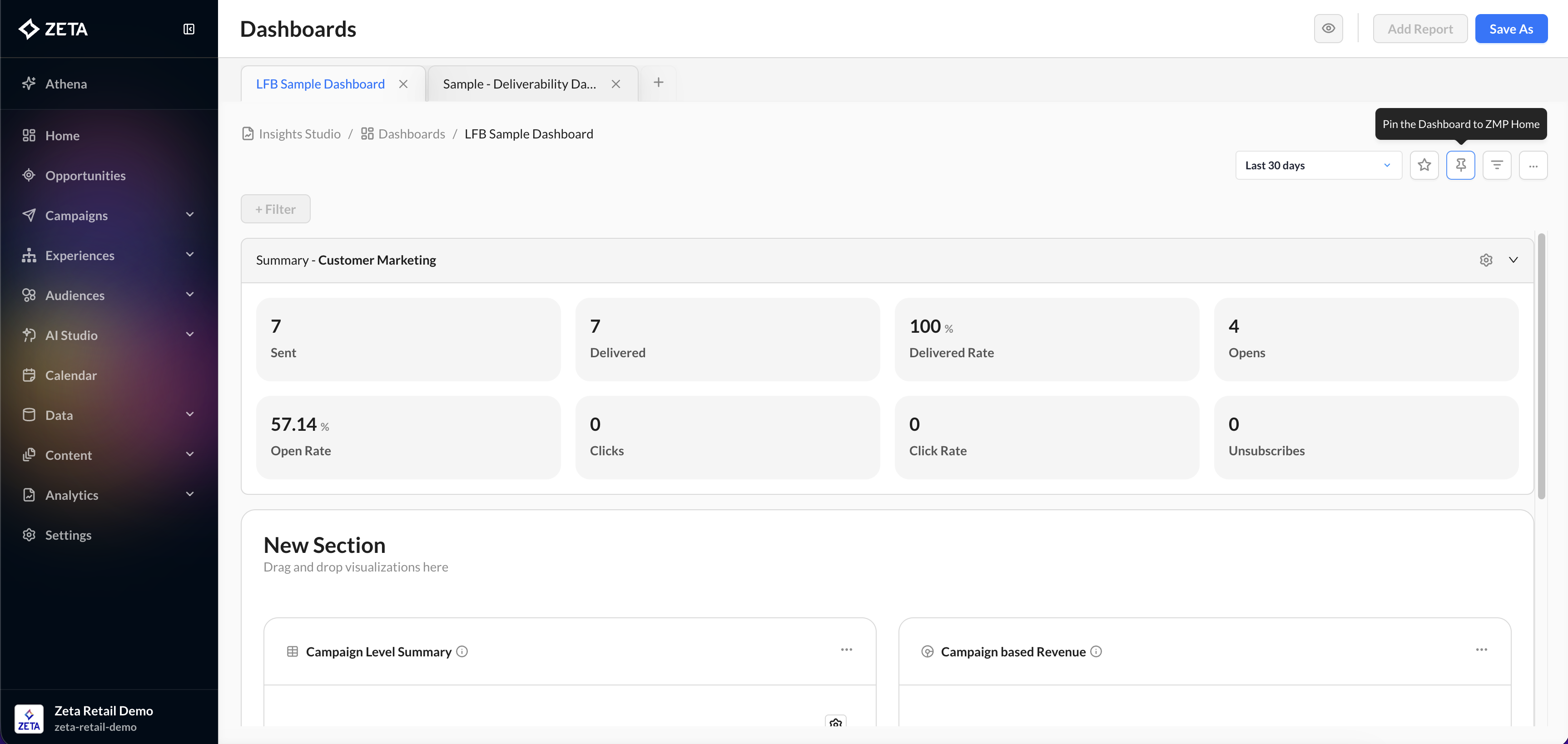 You can now pin Insights Studio dashboards directly to ZMP Home, giving you immediate access to critical performance insights the moment you log in. This enhancement surfaces key campaign, audience, and attribution dashboards alongside your default Home workspace. To keep the experience streamlined, the platform supports up to ten pinned dashboards and automatically manages tab overflow. The result is a more intuitive way to access your data without navigating between screens—improving discoverability, reducing friction, and accelerating decision-making. |