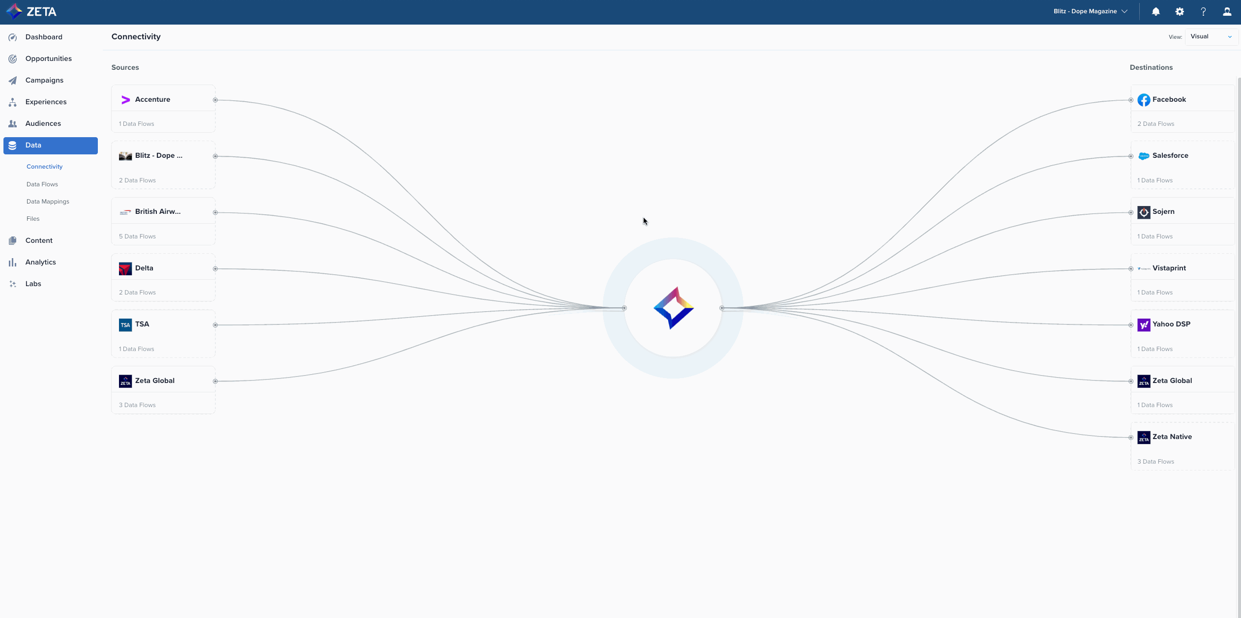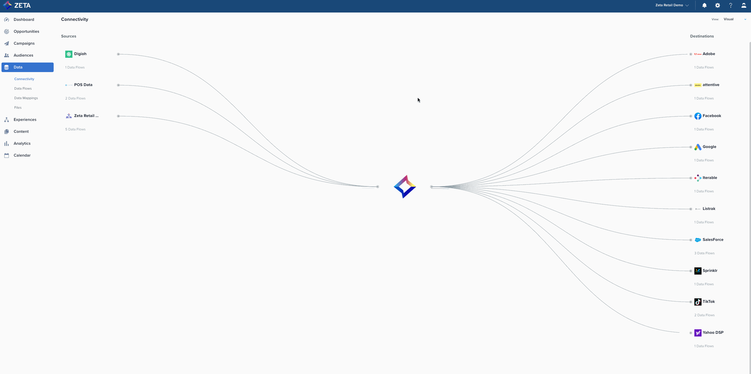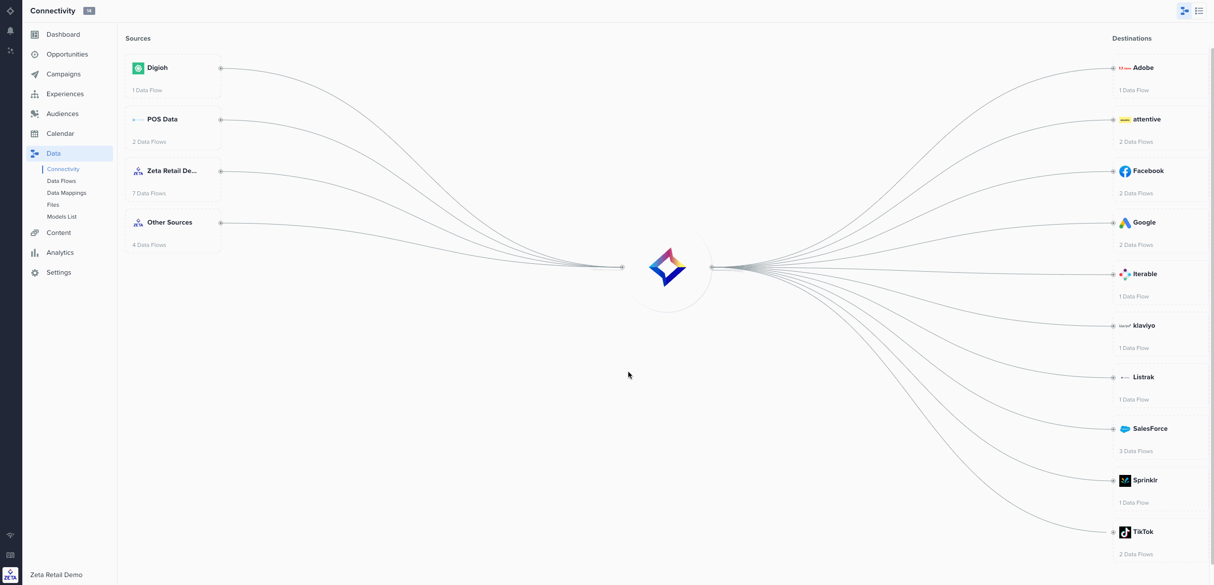 We have added a new unified view of all your incoming and outgoing data flows to/from the Zeta Marketing Platform. With this visual diagram, you can see the types of sources and vendors you are ingesting data from as well as the channels and locations where your data is ultimately activated. This connectivity canvas provides greater transparency and control over your data flows. |
