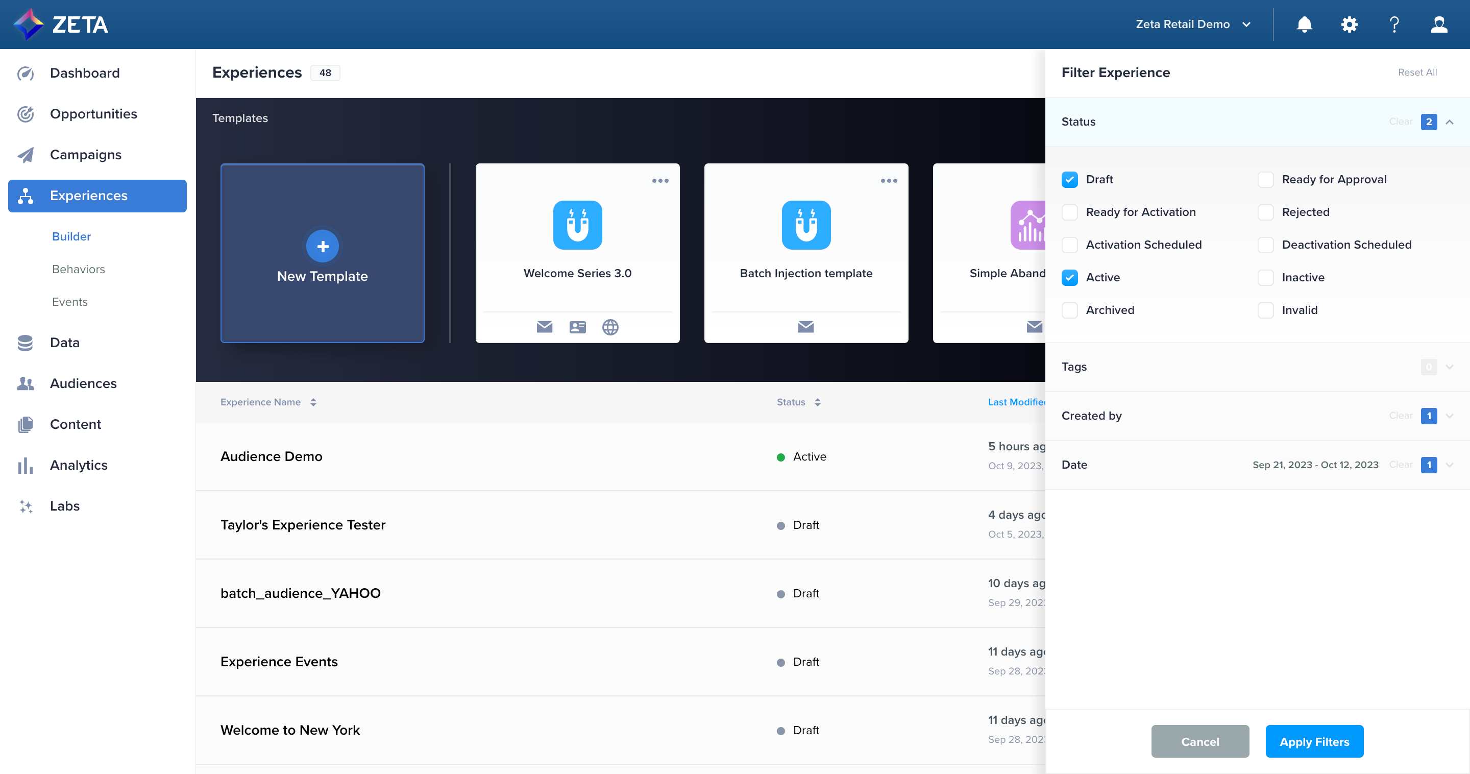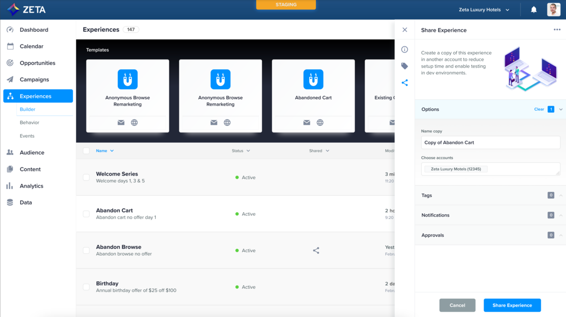 Experience Builder allows you to build elegant and complex customer journeys, but they may require approval before deployment. With our Experience Approval Management workflow enhancement, you can now review experiences, change status, and leave comments directly in the ZMP without needing to manage the review/approval process elsewhere. Contact Support to have this feature and Campaign Approval Management enabled for your account. |