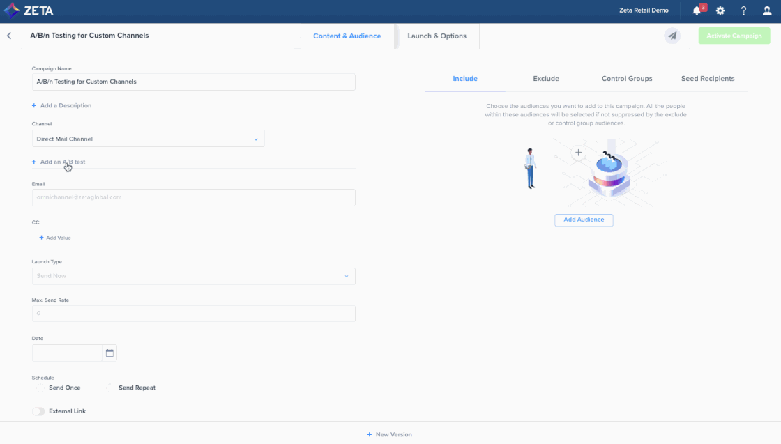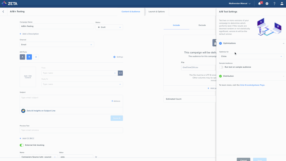 We have expanded the Zeta Marketing Platform’s A/B/n testing tool for broadcast campaigns with the following capabilities: