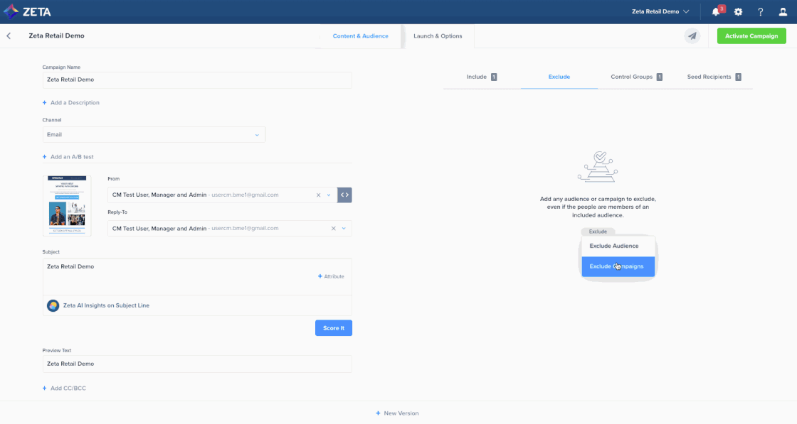 You can now easily exclude people from your campaign audience based on their interactions with another campaign or set of campaigns. For instance, you can limit the audience of a follow-up email to those who did not open or click a link in a previous campaign. With this enhancement, simply select your audience inclusion/exclusion criteria under the Content & Audience tab, eliminating the need to create one-time segments and simplifying the overall campaign creation experience. |