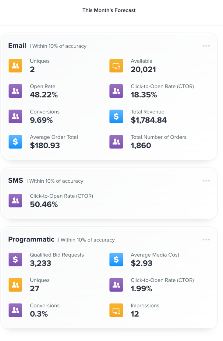 The more we know about an audience and how past behavior defines it, the more precisely we can forecast the outcome of an individual or series of campaigns. New in the ZMP, Forecasting Calendar enables you to visualize multichannel campaigns across weeks, months, and even years based on forecasted metrics you define. Best of all, the Forecasting Calendar spans owned and paid channels for a true omnichannel calendar and forecast.