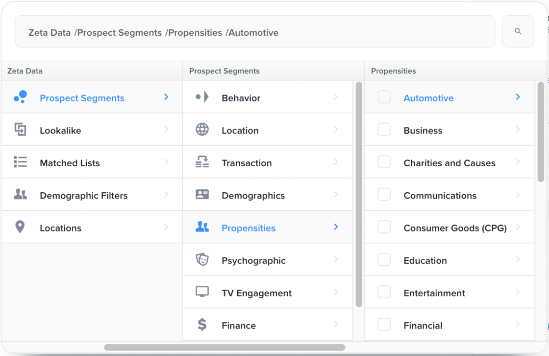 Changes have been made to improve the clarity and findability of demographic and propensity segments in Audience Explorer. Former demographic segments focused on propensities have been moved to a new Propensities section, where each audience includes sub-segments for people who are most likely, moderately likely, and slightly likely to exhibit a behavior, ultimately giving marketers more control over the accuracy and reach of propensity targeting. In addition, Zeta’s demographic audiences now include inputted demographic data to boost accuracy and reach. |