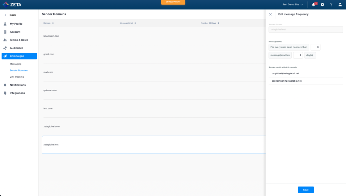 We have expanded our options for setting message frequency to include sender domain. This allows users to set a limit of messages within X number of days for every user from each domain, providing marketers with finer control over email reputation and subscriber fatigue. |