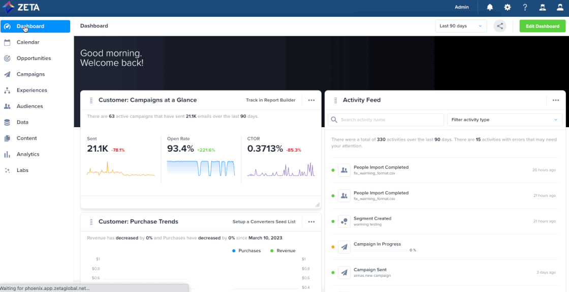 We’re excited to announce that we’ve added a search and filter feature to the Activity Feed widget on the Dashboard. Gone are the days of scrolling through activities to find what you need. You can now quickly and easily search for specific activities or filter them by campaign, segment, file import, and more. |
