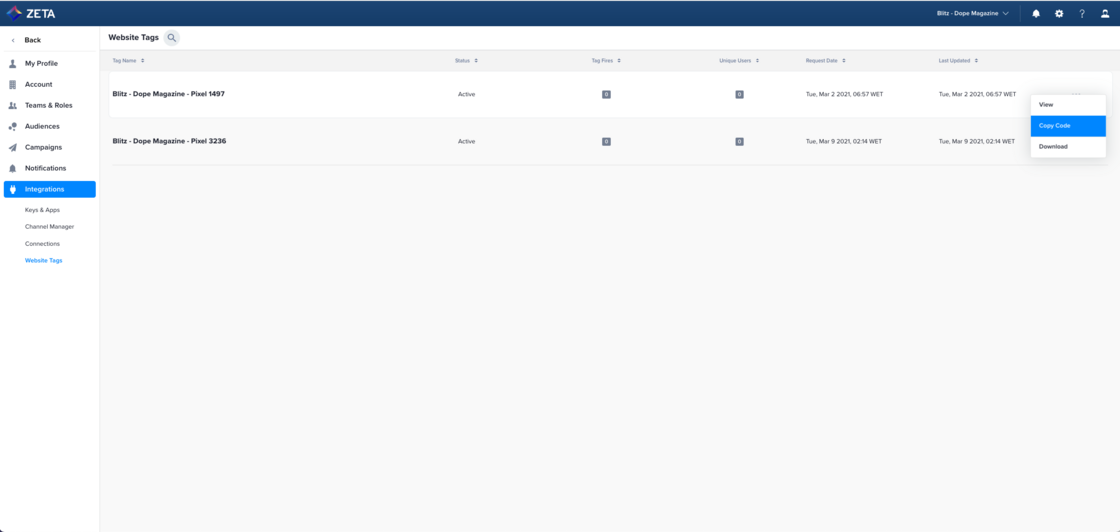 Within your ZMP account, you can now view, copy, and download your Website Tags (previously referred to as Zync Pixels). This new feature allows you to view the status of each tag (active versus passive) and obtain immediate feedback on crucial metrics such as number of tag fires and unique users observed. |