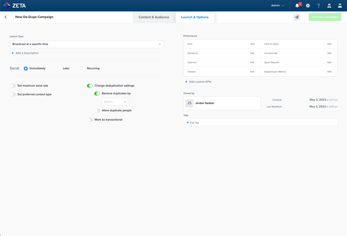 You can now set the duration of campaigns by enabling the Set throttling by time toggle and inputting the number of hours under the Launch & Options tab. With this enhancement, you no longer have to calculate the maximum send rate manually. |