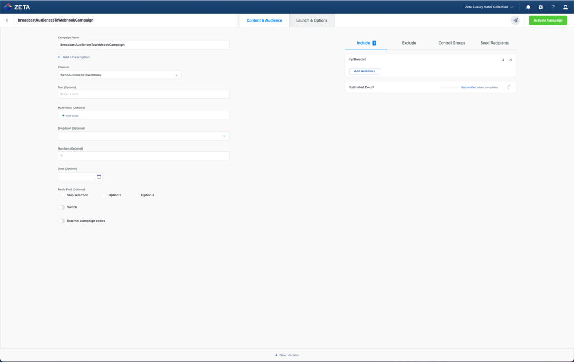 We have expanded our A/B/n testing feature in broadcast campaigns to include any channel. This allows you to split the audience and send different content variants for both native channels (email, SMS/MMS, push) and any custom channel created via Channel Manager. |