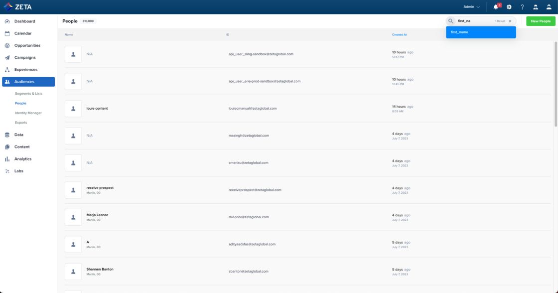 We now allow users to limit their search results on the People page to a specific field/identifier for cases where a single value may return many results due to the similarity of certain identifiers. Users can now search for first name, last name, full name, BSIN, contact values, email, user_id, or unique client ids, and results will be returned more quickly. |