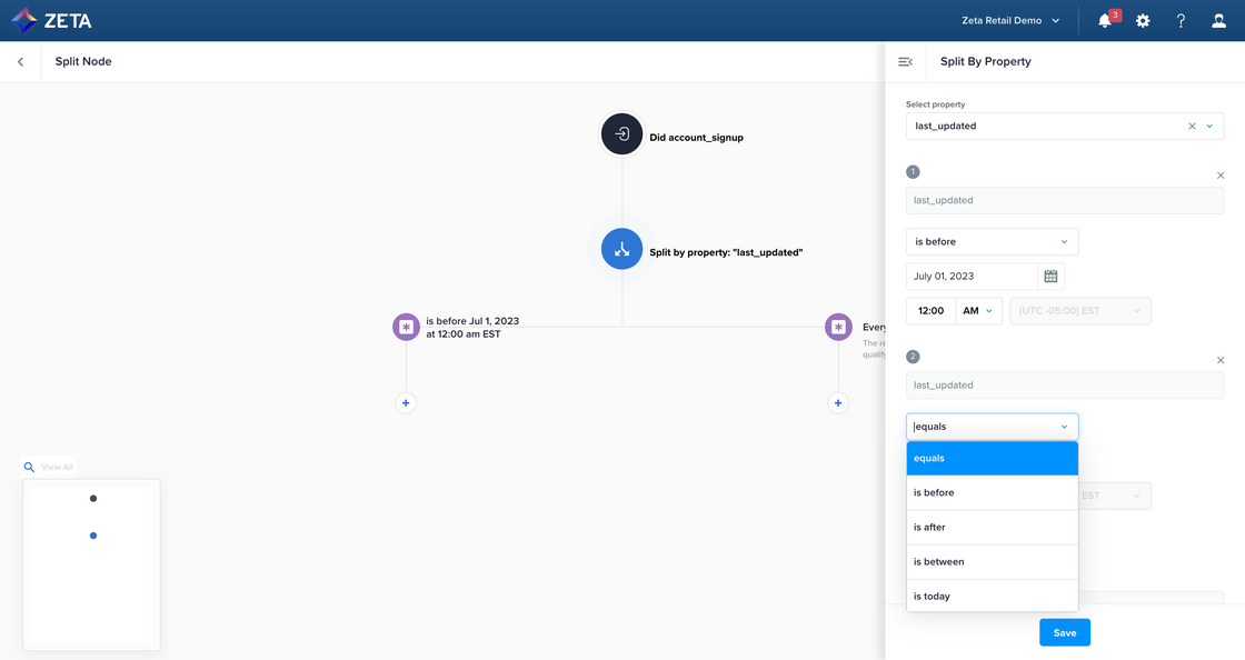 We have enhanced the Split by Property node in Experience Builder so you can target users by new data types and an expanded list of operators across existing data types. Most notably, we’ve introduced date data types, which allow you to segment based on properties that use timestamps, such as birthdate, purchase date, or creation date. Additional data types include negative operators (e.g., does not equal), partial match operators (e.g., starts with), and value exists/does not exist. |
