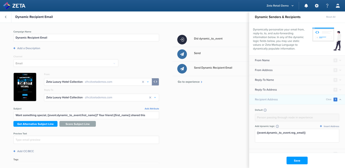 You can now override the To: field in both triggered email and SMS campaigns created in Experience Builder. Use Zeta Markup Language to pull in alternate contact information derived from events to target users related, but not equal, to the person who completed the event. Previously only available in our legacy triggered campaigns editor, this feature allows you to target secondary contacts for events, such as friend referrals and hotel confirmations. |
