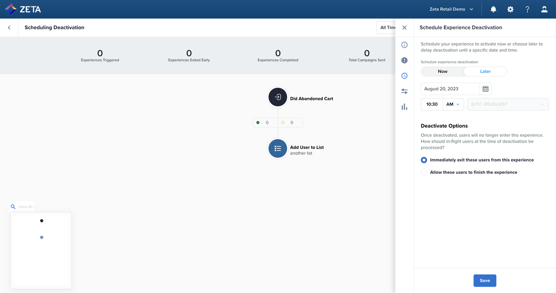 Finished building an experience but still a few days away from launch? You can now schedule activation for a future date. While experience activations still default to “Now,” you can adjust the scheduling by selecting “Later” and choosing a specific date/time. |
