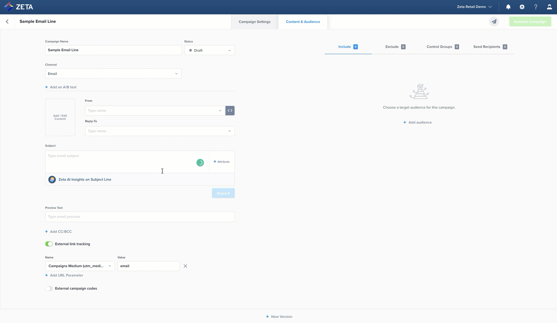 3. Navigate to the Content & Audience tab and click on Zeta AI Insights on Subject Line under the Subject FIeld.